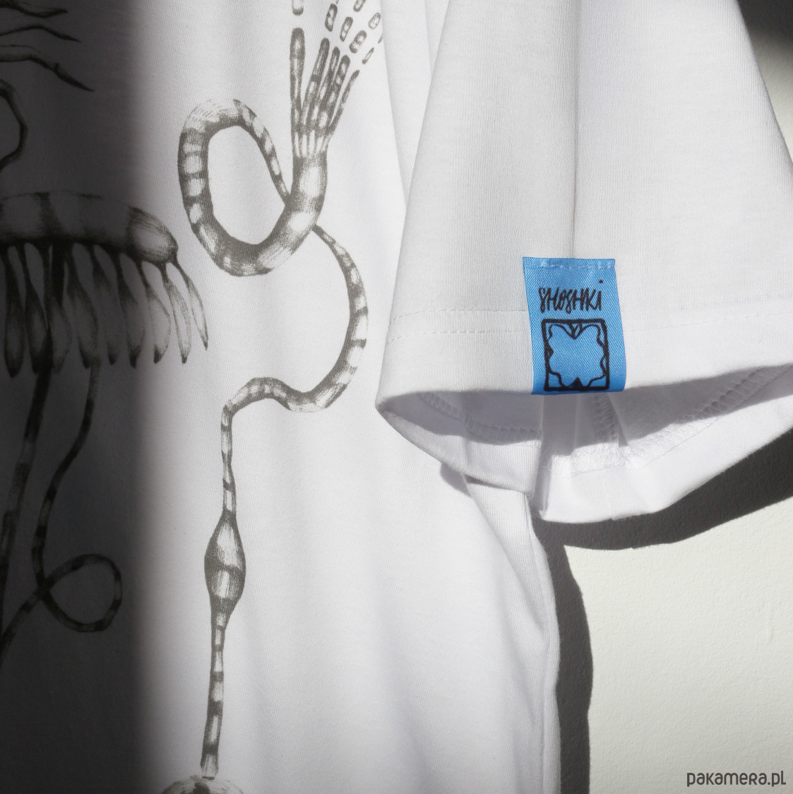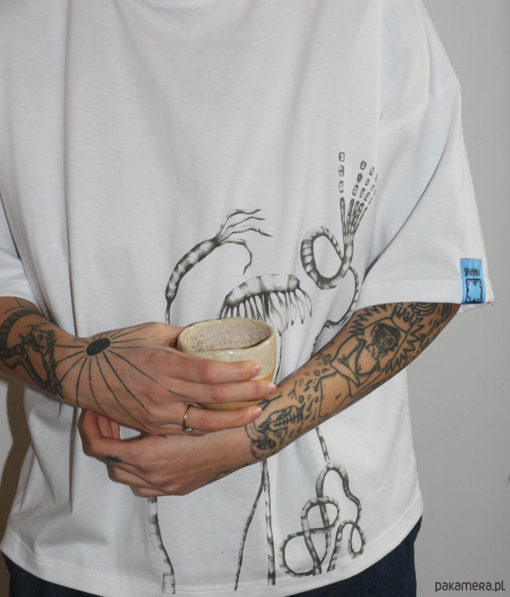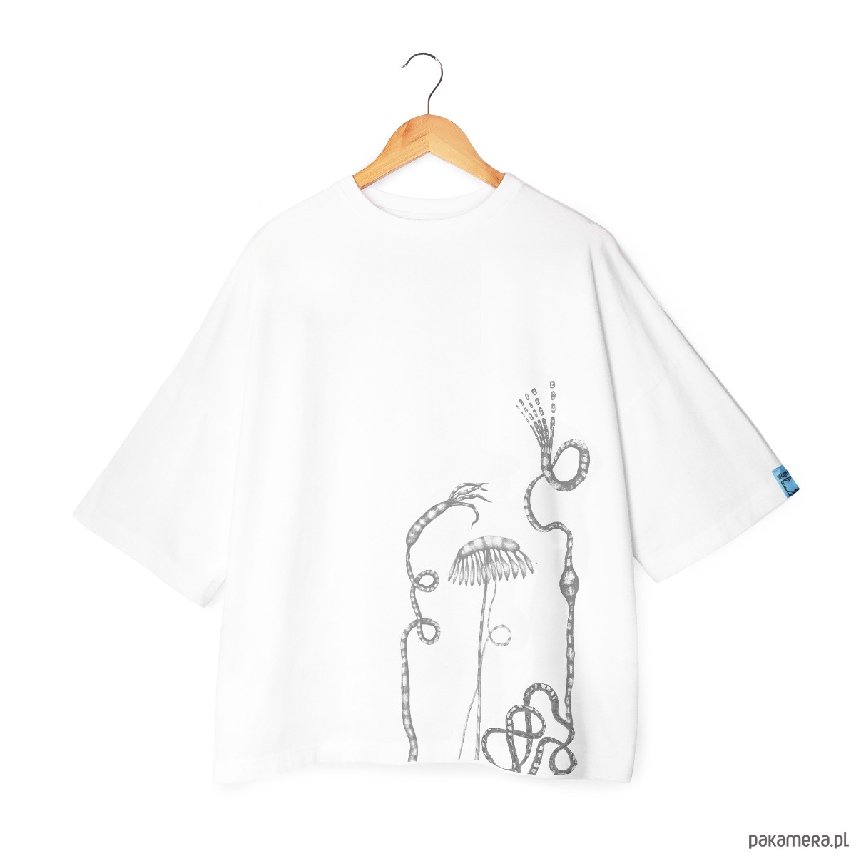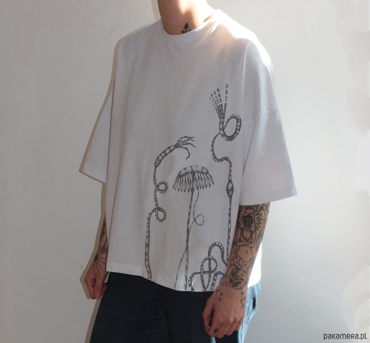 Biały T-shirt o naszym autorskim kroju oversize. Dostępny w trzech rozmiarach. Na przodzie asymetryczny motyw trzech roślinnych kształtów w odcieniach szarości. Prosta forma białej koszulki z subtelnym rysunkiem, tworzy doskonały codzienny basic i podstawę do wielu stylizacji.