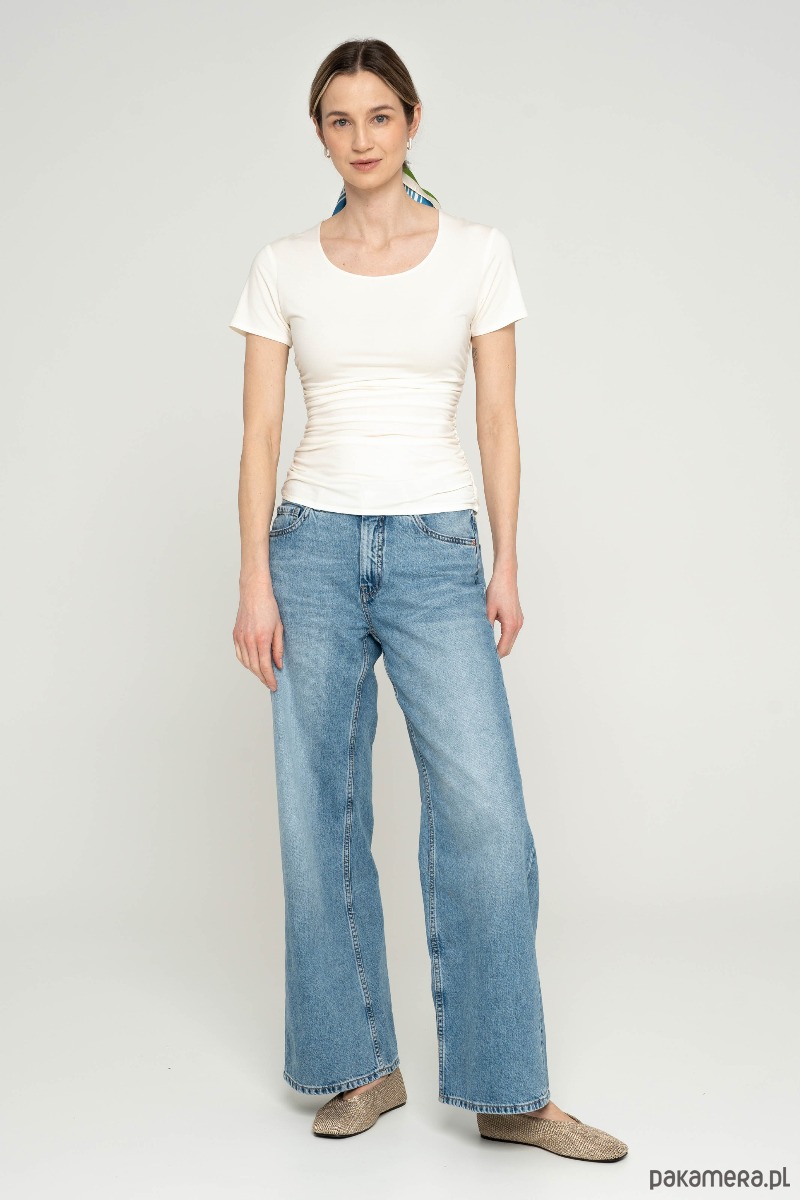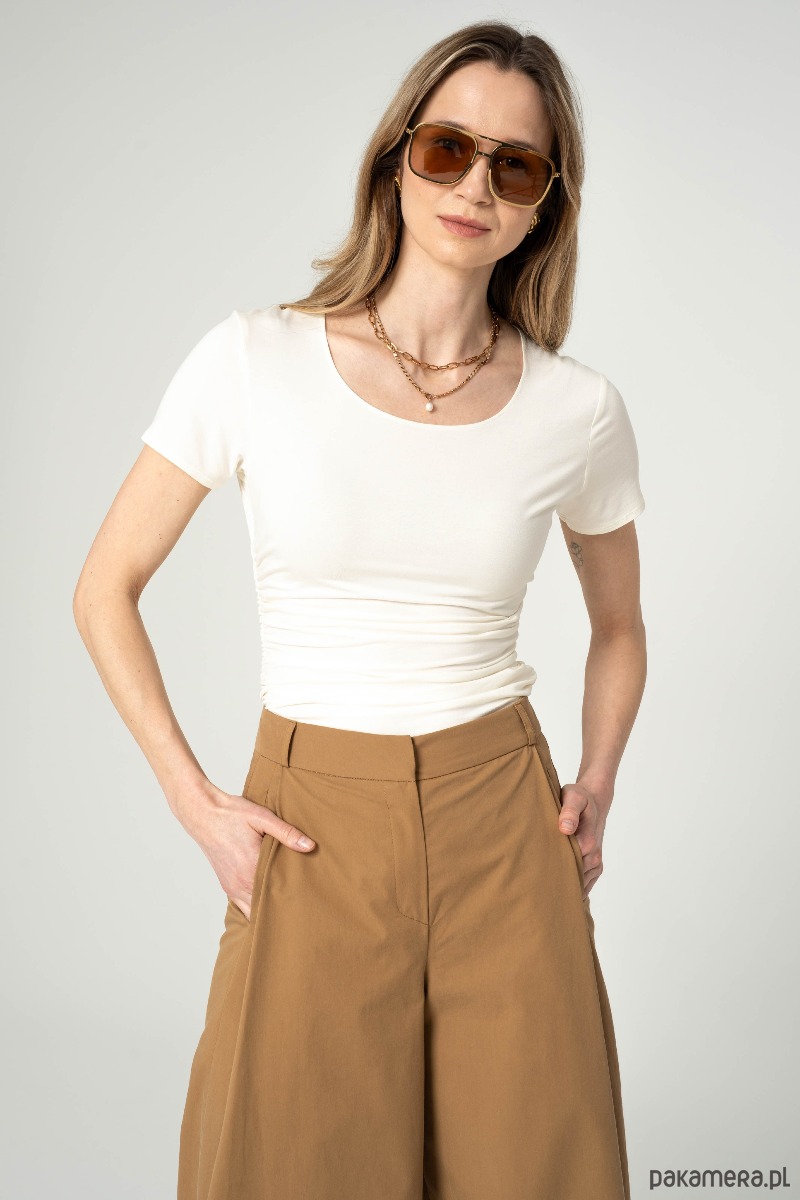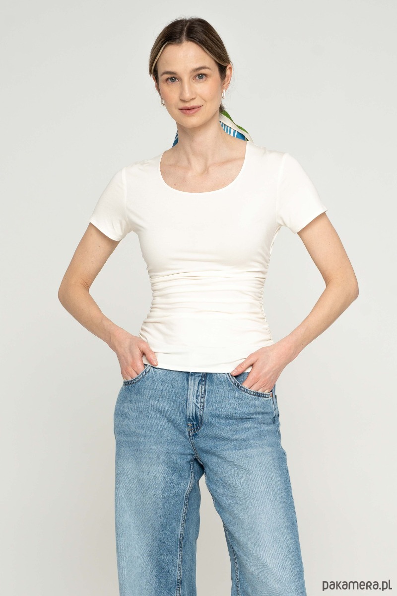 T-shirt z okrągłym dekoltem i drapowaniem po bokach. W szwy boczna ma wszyte gumki, pozwala to kontrolować układanie materiału. Forma t-shirtu dopasowana, lekko zmarszczona. Rękaw krótki, dopasowany.