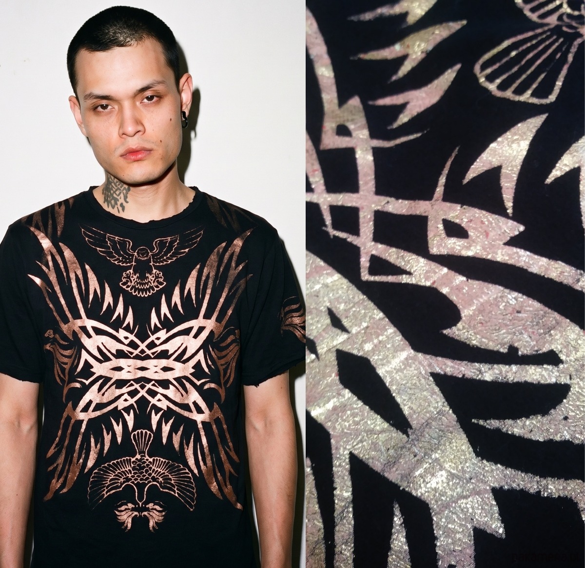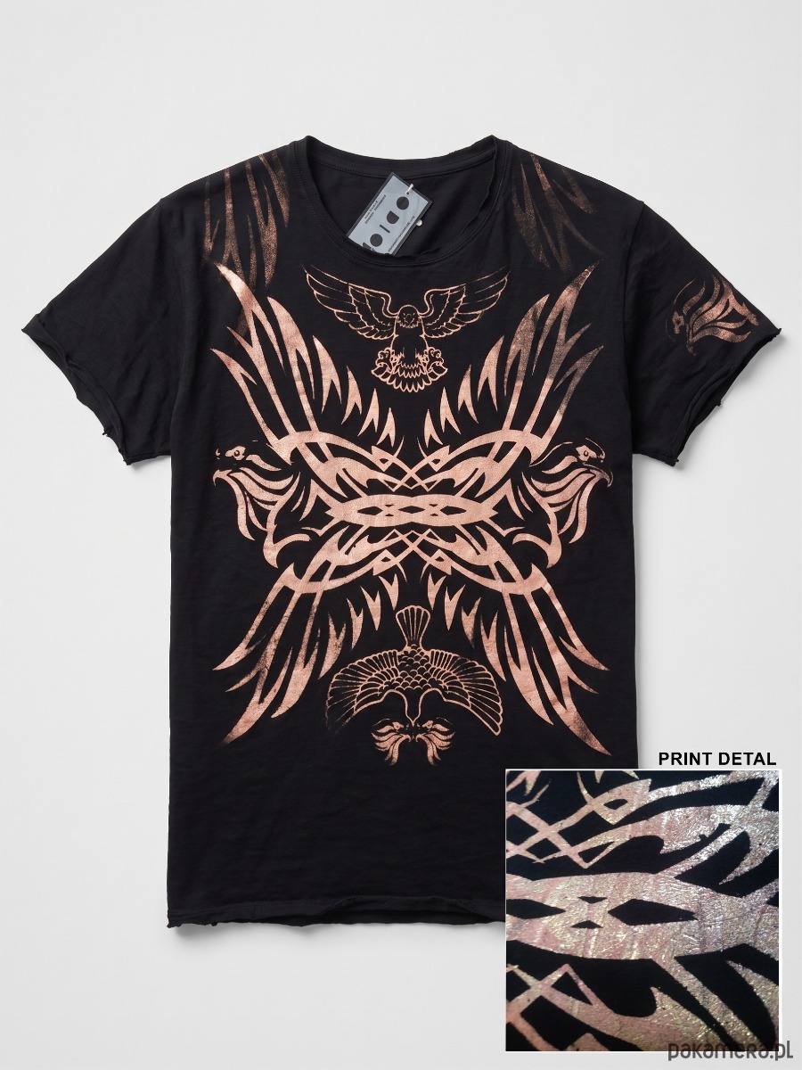 Centralnym punktem jest autorski nadruk wykonany ręcznie techniką sitodruku – metaliczny pigment o nieregularnej strukturze odbija światło, dając efekt niemal biżuteryjny. Motywy inspirowane są symboliką zwierzęcą i organiczną geometrią – łączą w sobie drapieżność i delikatność. Każdy egzemplarz ma unikatowe przetarcia i mikroróżnice w druku.