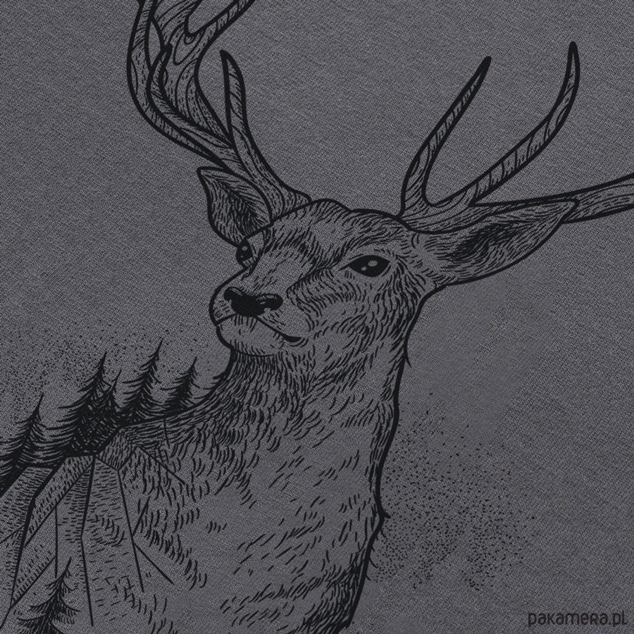 Koszulka męska w ciemnoszarym kolorze z nadrukiem przedstawiającym króla polskich lasów - jelenia szlachetnego. T-shirt przypadnie do gustu wszystkim osobom kochającym polską przyrodę i dzikie zwierzęta. Jelenie występują we wszystkich większych kompleksach leśnych w naszym kraju, w szczególności w liściastych i mieszanych lasach nizinnych i górskich. Żyją w stadach nazywanych chmarami. Są roślinożercami żerującymi głównie w nocy, w dzień ukrywają się w gęstwinach lasu.Samce jeleni (byki) posiadają potężne i rozłożyste poroża, które co roku zrzucają. Nowe odrastają w bardzo szybkim tempie, po 3 miesiącach są równie efektowne, jak te poprzednie. Wrzesień to okres godowy jeleni, odbywają się wówczas tzw. rykowiska. Samce całymi nocami ryczą chcąc w ten sposób zaimponować łaniom. Jelenie to zwierzęta majestatyczne, pełne dostojeństwa, powagi i gracji. Imponują swoją wielkością i siłą, dlatego symbolizują męstwo, dumę i naturalną szlachetność.