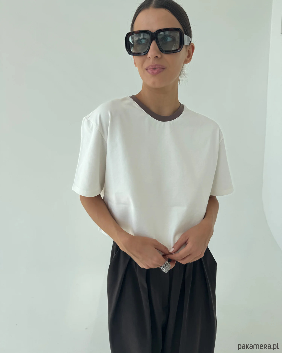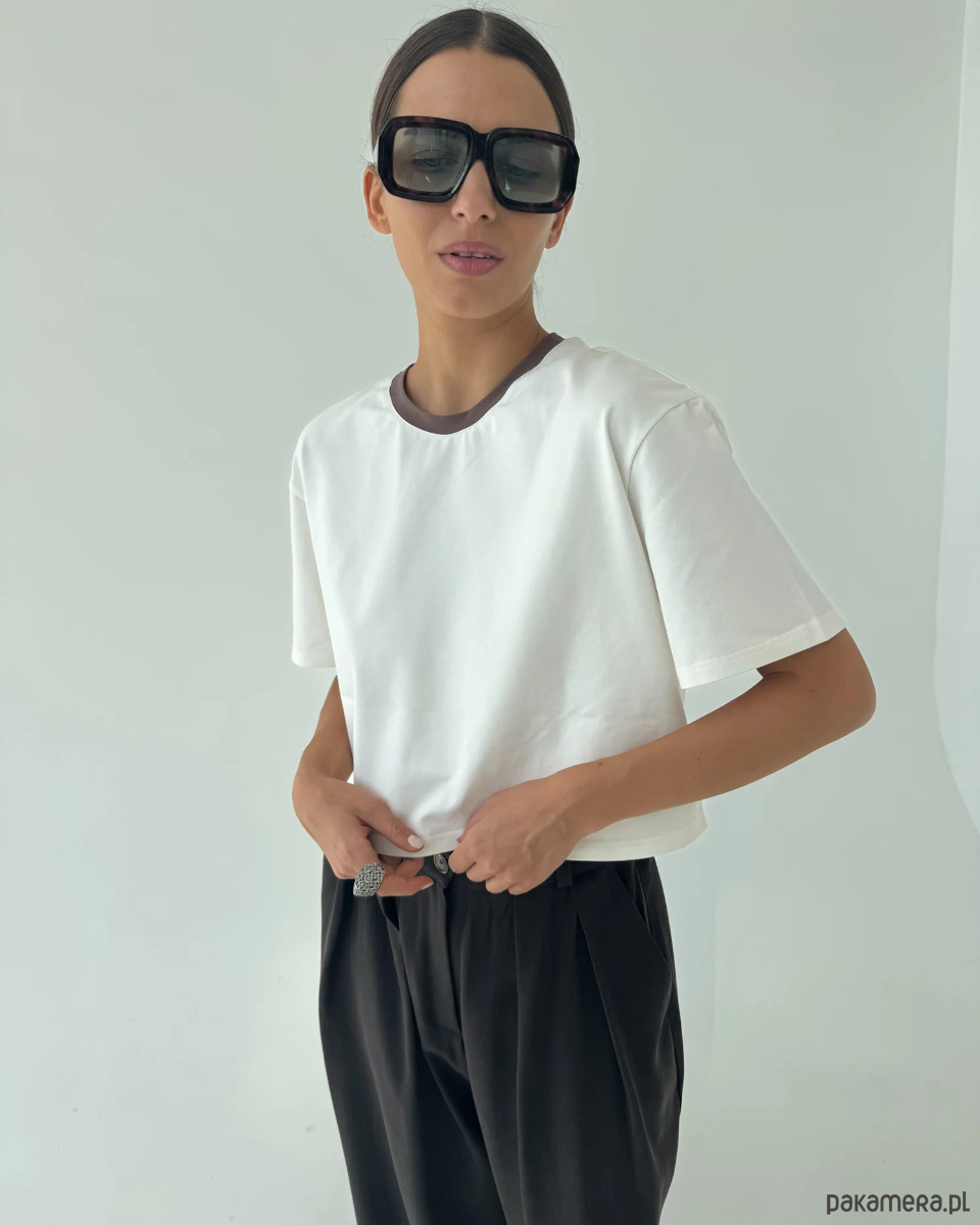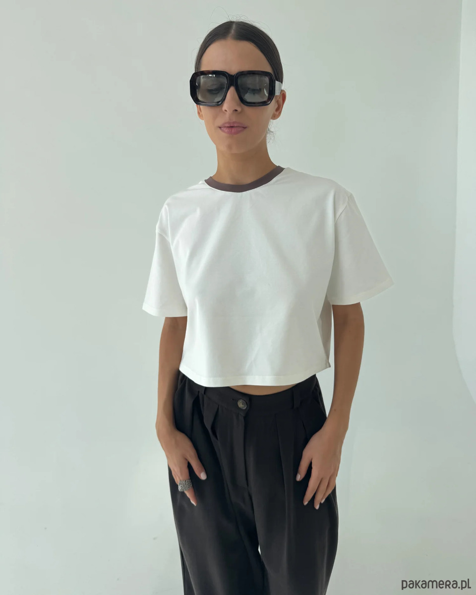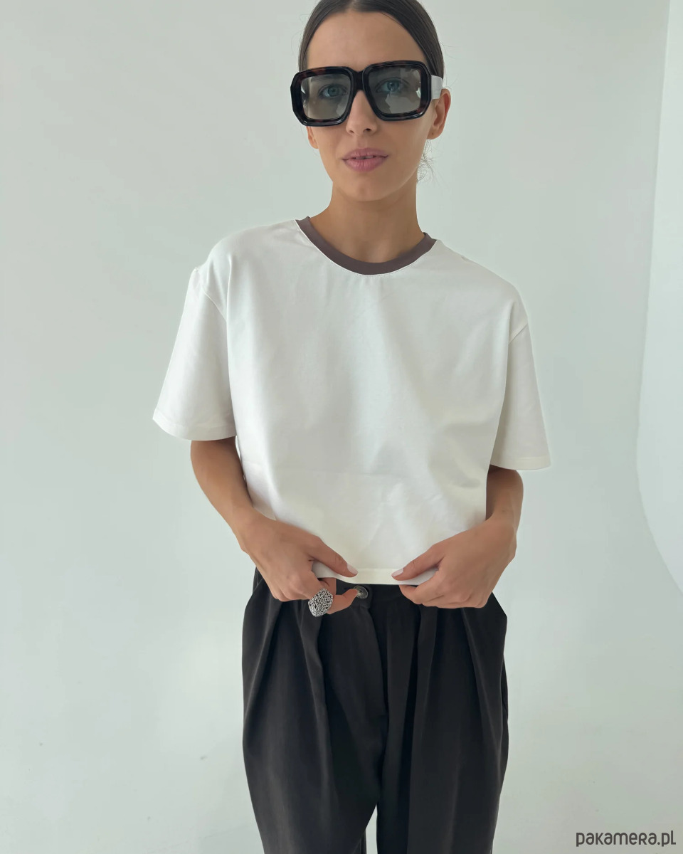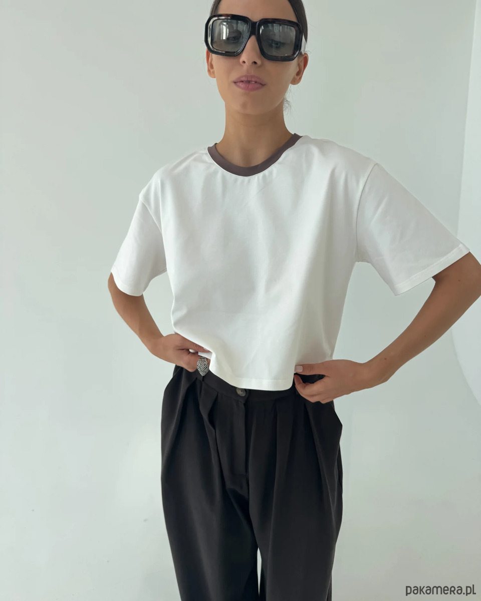 Uszyty z miękkiej bawełny premium, wyróżnia się skróconym krojem crop i kontrastową plisą w odcieniu cacao przy dekolcie. Ten detal nadaje całości nowoczesnego, graficznego charakteru, sprawiając, że T-shirt staje się czymś więcej niż codzienną bazą.