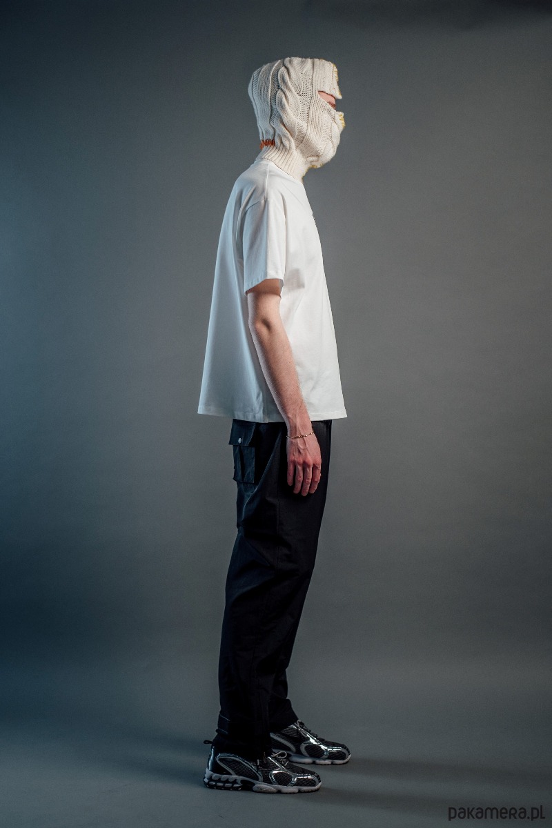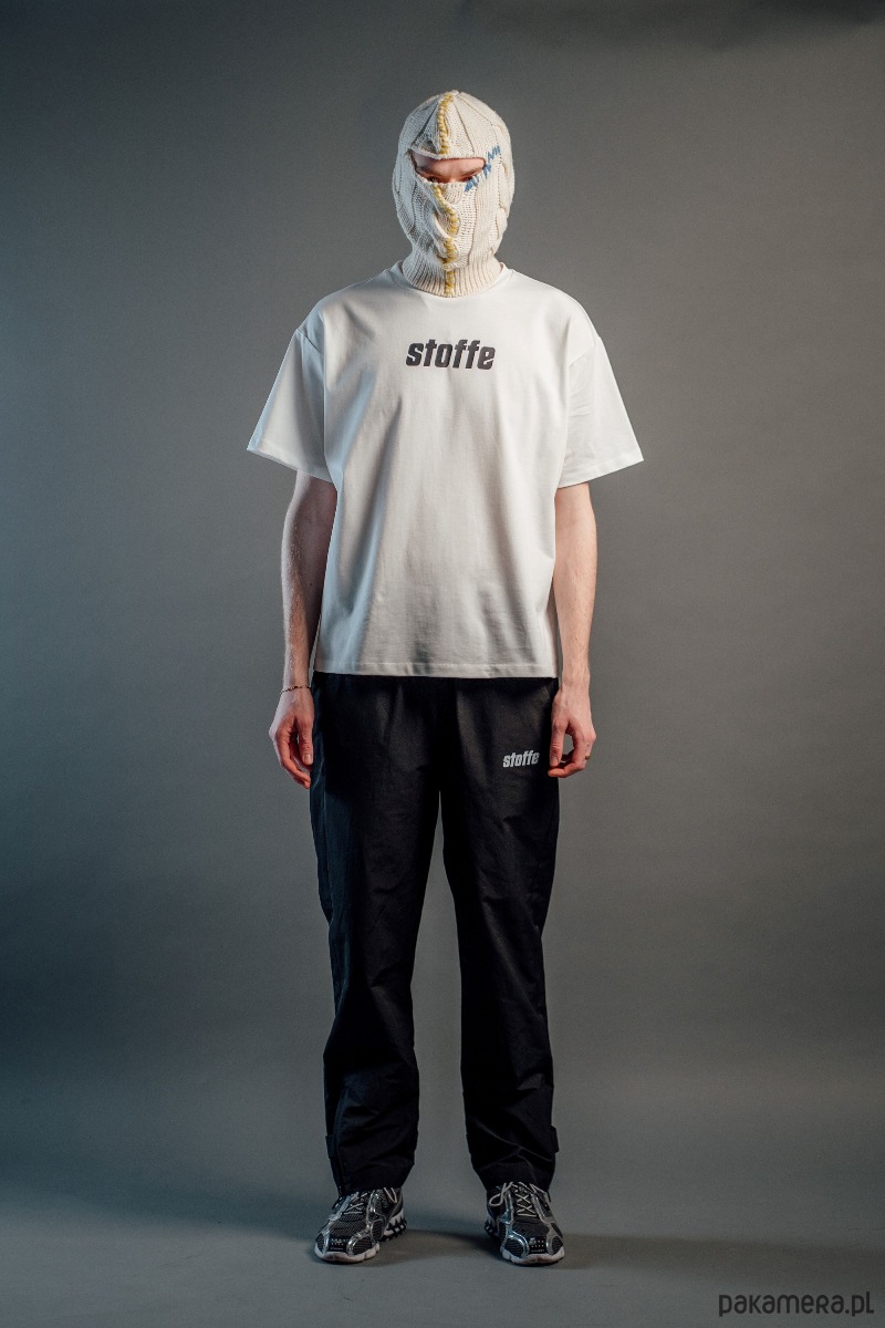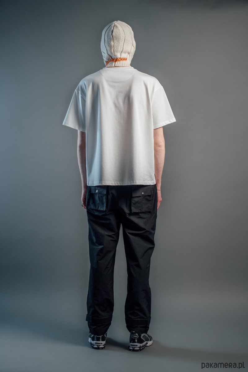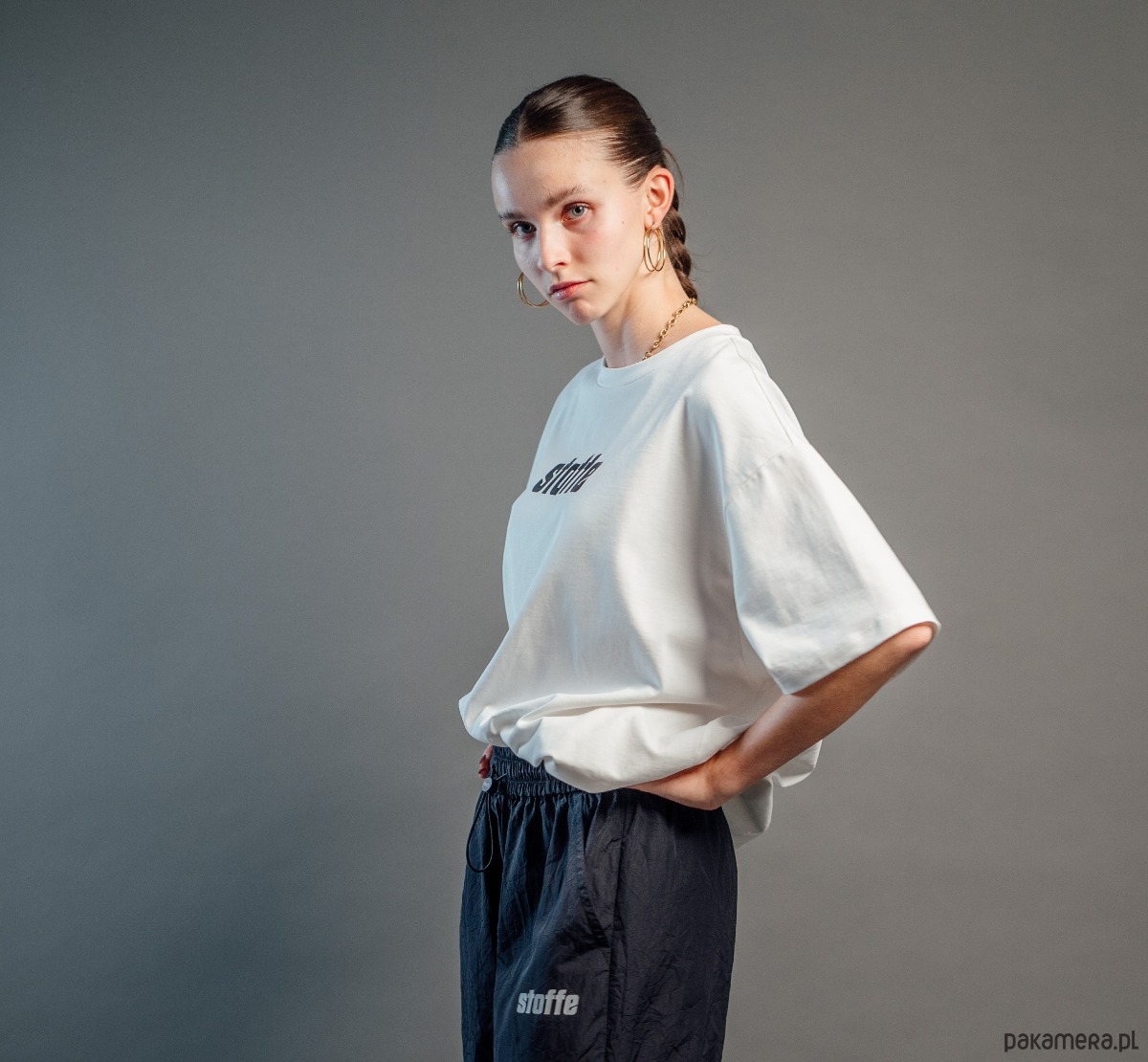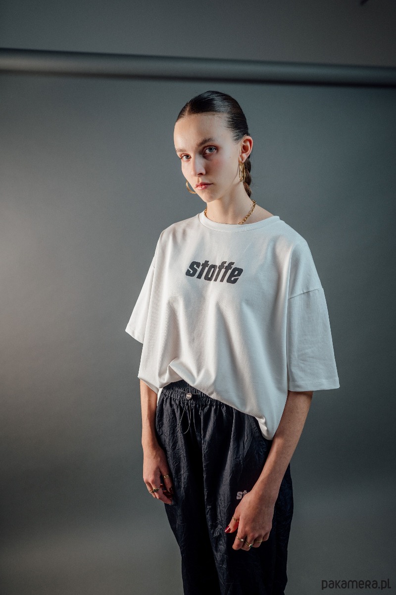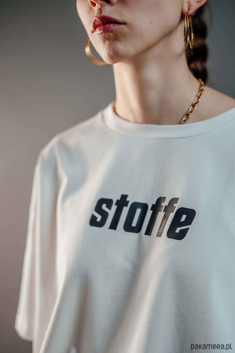 T-shirt z mięsistej dzianiny z logo w kolorze off white, forma pudełkowa z opadającym ramieniem.