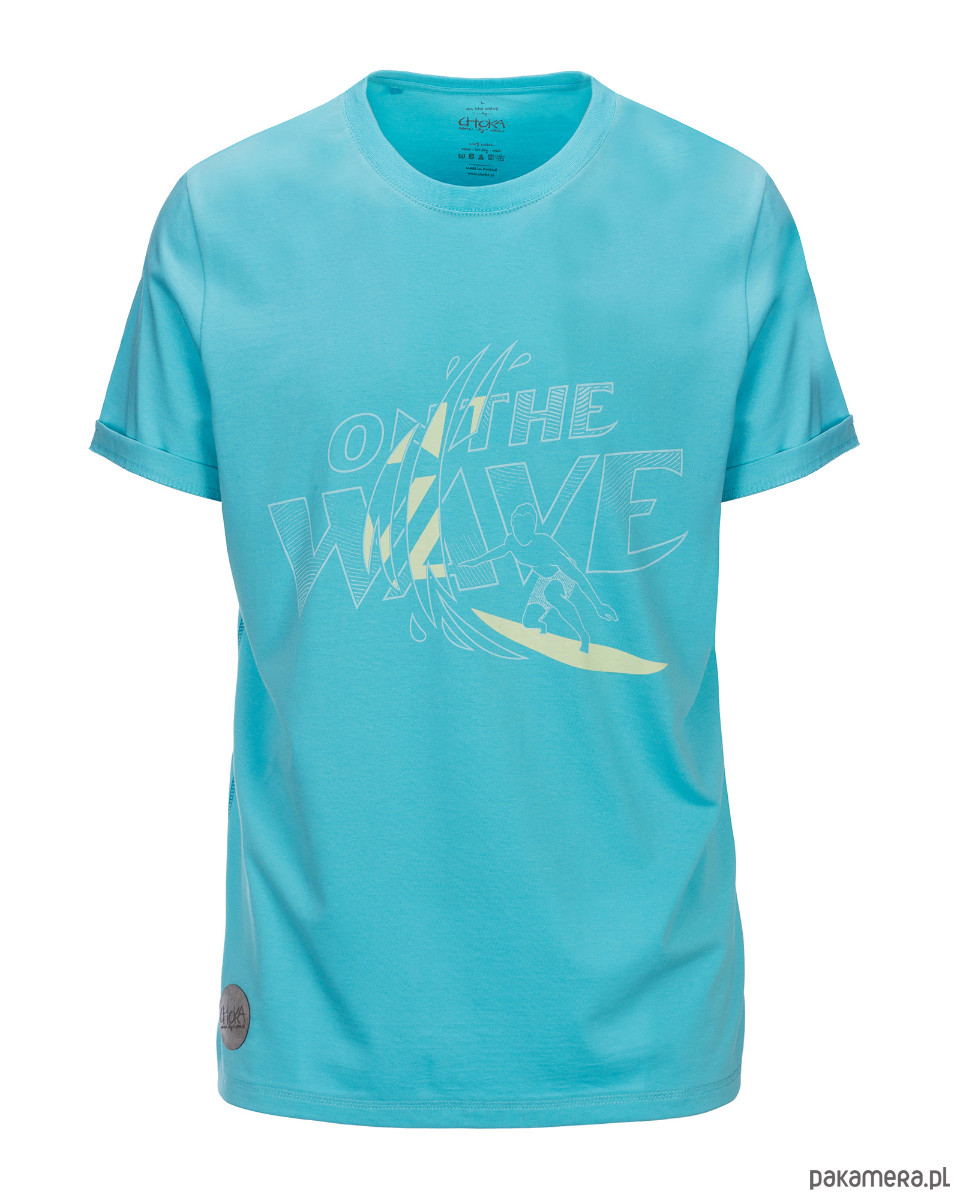 Wykonany z miękkiego, przyjemnego w dotyku, a zarazem bardzo trwałego materiału, t-shirt CHOKA o klasycznym, męskim kroju. Podwinięte na stałe rękawki, świetnie się układają. Z przodu miękki, trwały nadruk farbami wodnymi: ON THE WAVE i naszywka CHOKA z eko skóry.