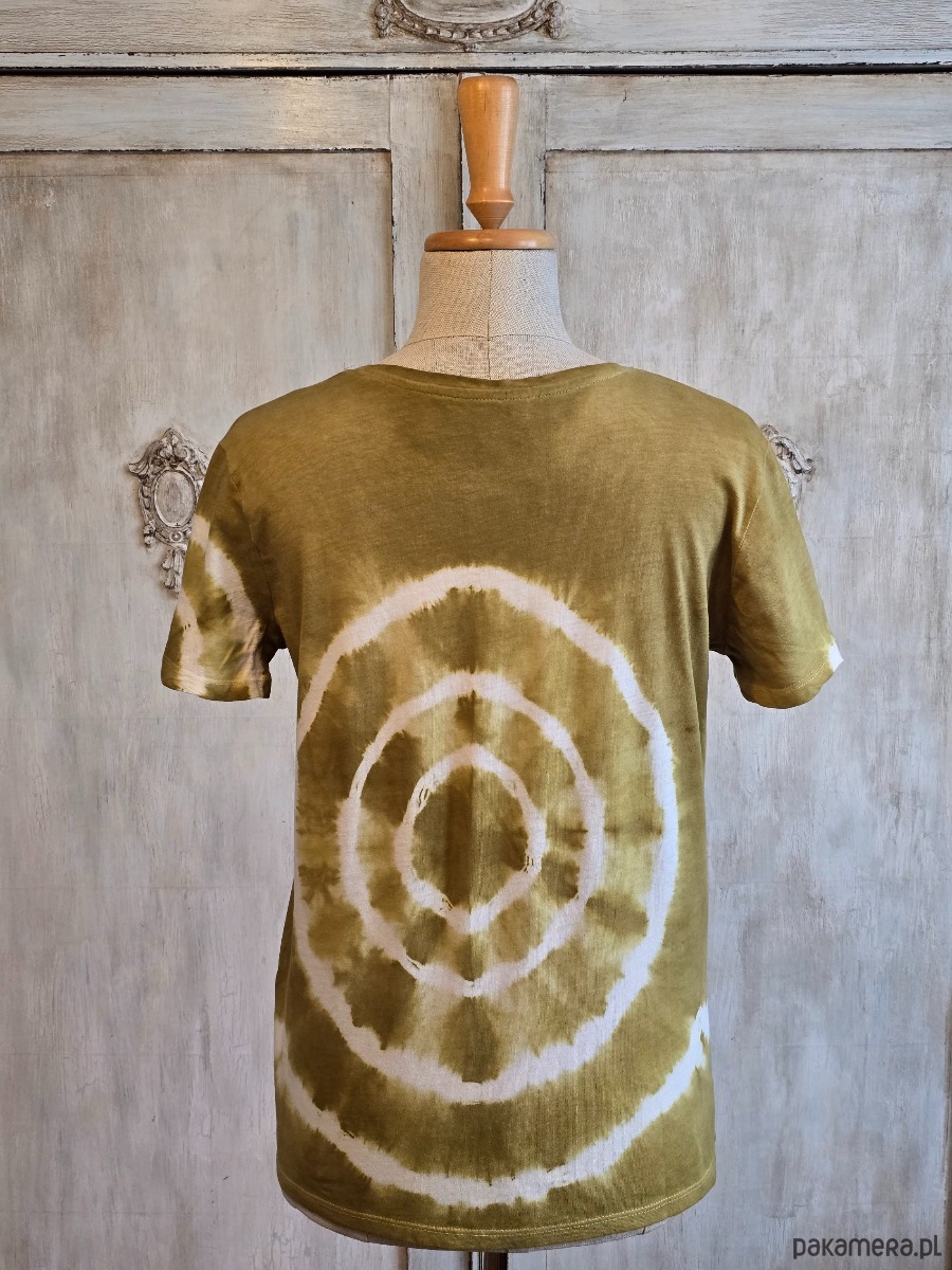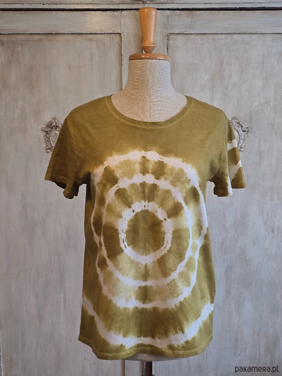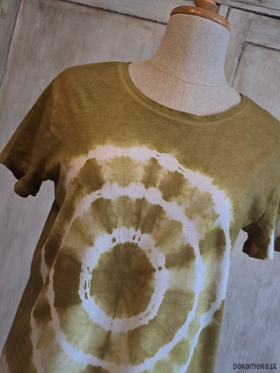 Wzór został naniesiony na nową, bawełnianą koszulkę techniką shibori, metodą farbowania naturalnego.