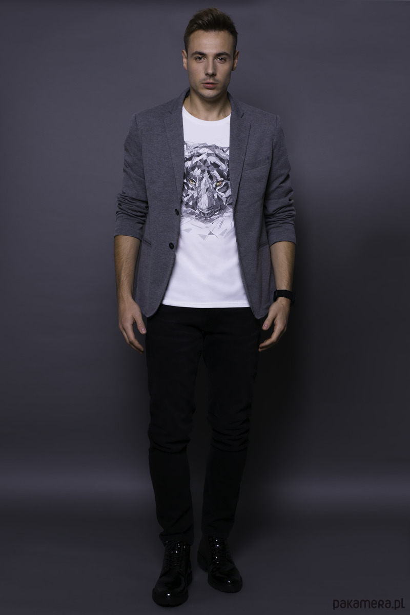 Wzrost modela to 186 cm, obwód klatki piersiowej 100 cm, nosi rozmiar M.