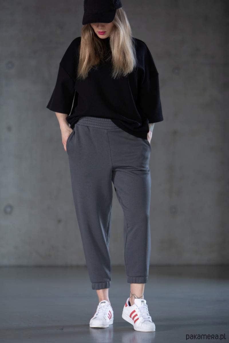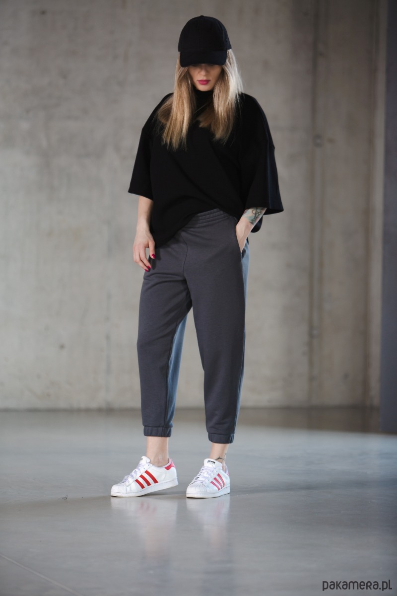Fason oversize, o prostym, pudełkowym kroju ze znacznie obniżoną linią ramion. Krótki, przedłużany rękaw.
