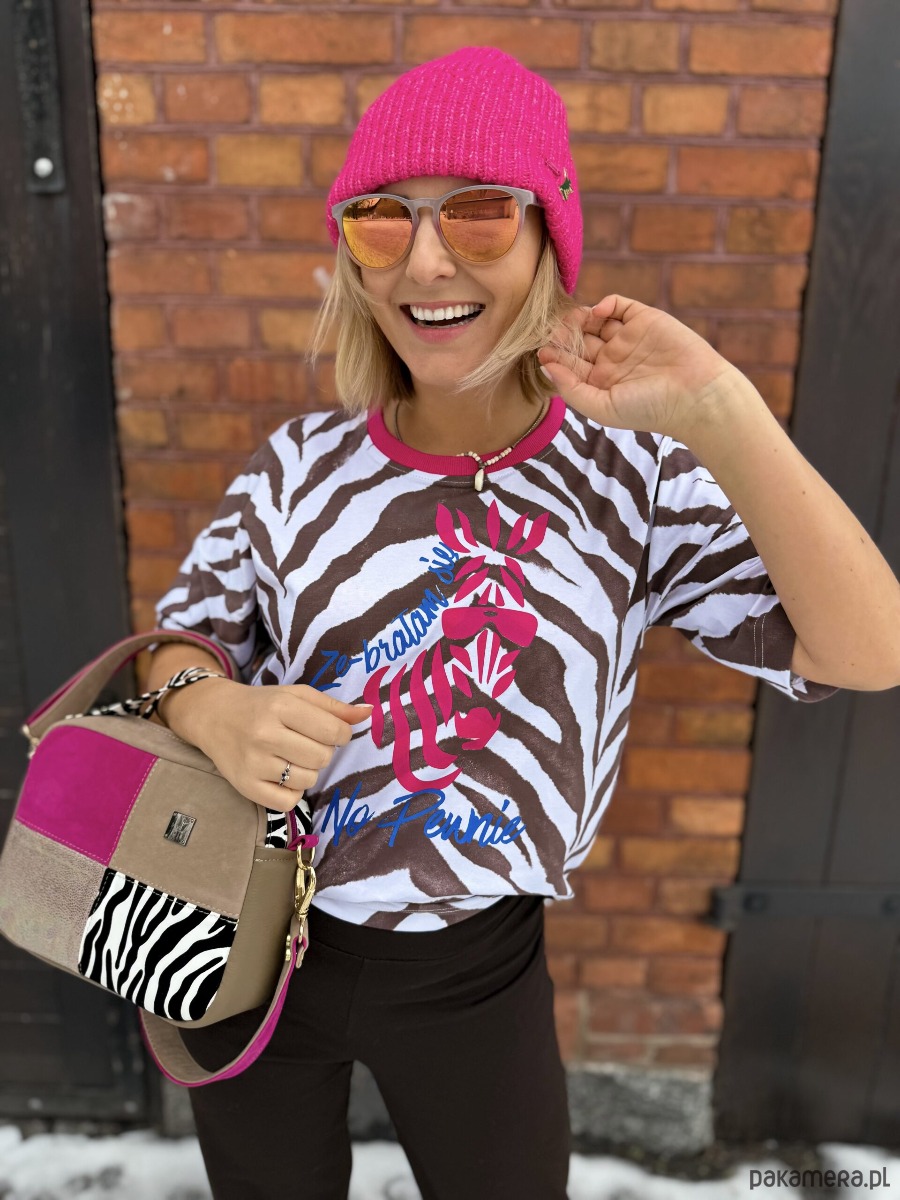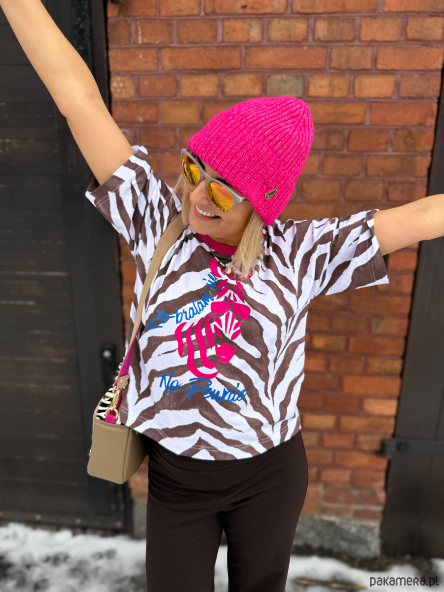 Zebra print w nowoczesnym wydaniu przyciąga spojrzenia, a różowy akcent dodaje energii i charakteru. Ten T-shirt nie jest tłem – on gra pierwsze skrzypce w stylizacji. Wystarczy prosty dół i gotowe.
