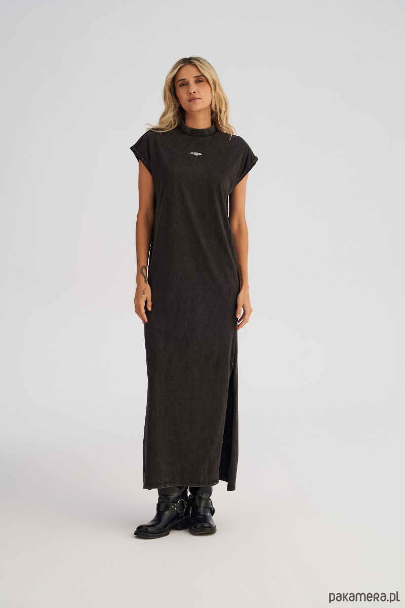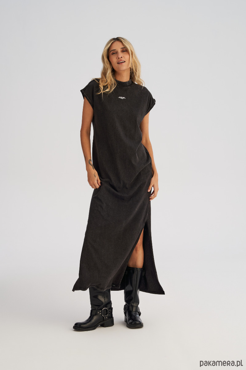 Sukienka maxi z efektem sprania, inspirowana klasycznym T-shirtem. Ma dopasowany dekolt pod szyję z prążkowaną plisą, krótkie rękawy i prostą linię przełamaną rozcięciami po bokach dla większej swobody. Na mostku minimalistyczny nadruk, który dodaje smaku ale nie odwraca uwagi. Miękka dzianina ładnie układa się na sylwetce.