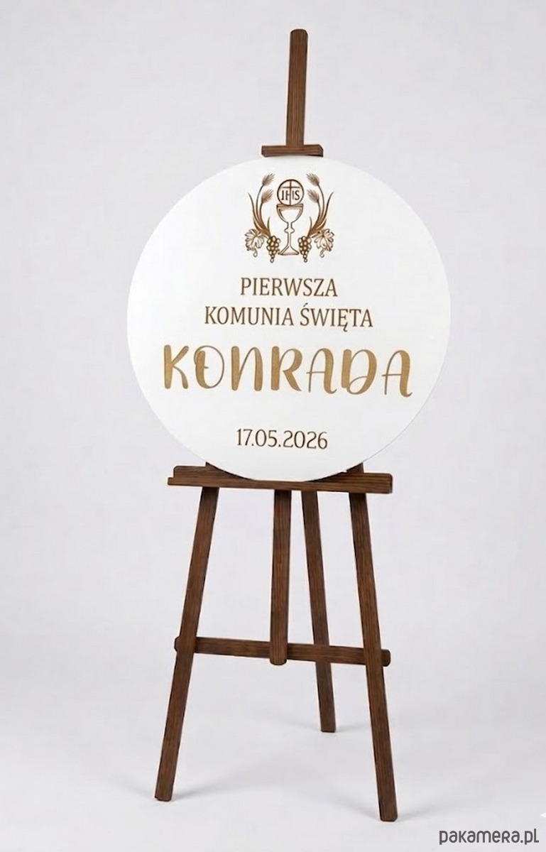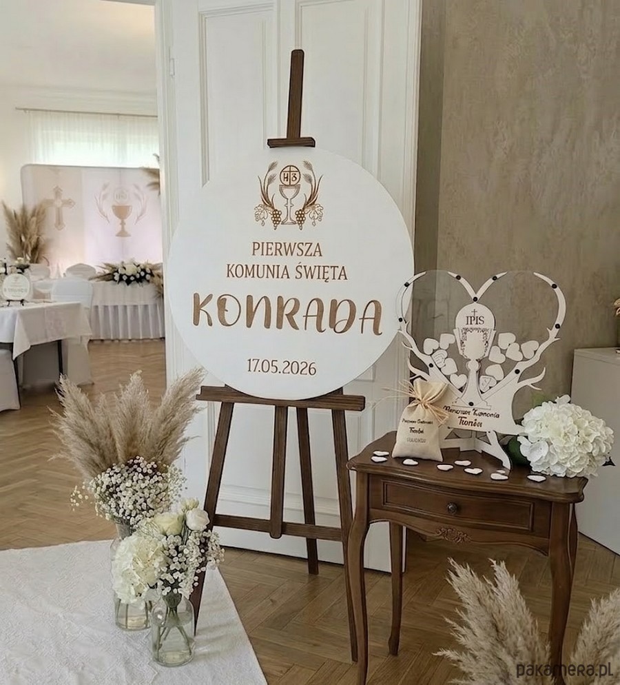 Tablica może być ustawiona na sztaludze lub wykorzystana jako część dekoracji przy wejściu, tworząc efektowną oprawę wydarzenia. Po uroczystości pozostaje także piękną pamiątką z dnia Pierwszej Komunii Świętej.