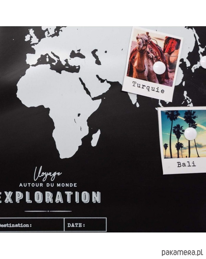 Efektowna dekoracja na ścianę w formie mapy świata. W ramie. Powierzchnia jest magnetyczna.