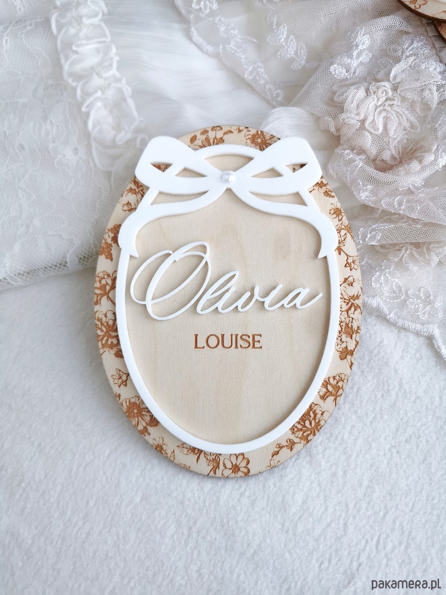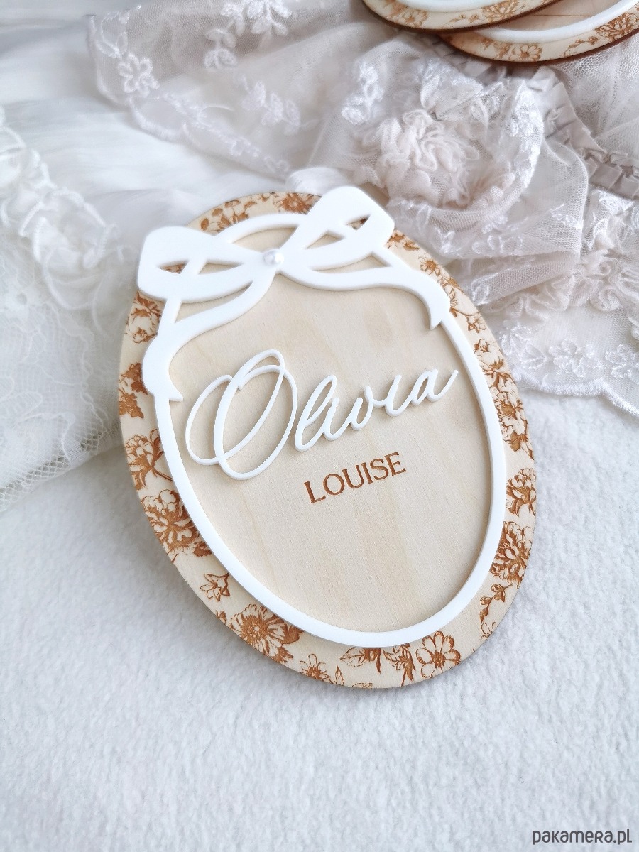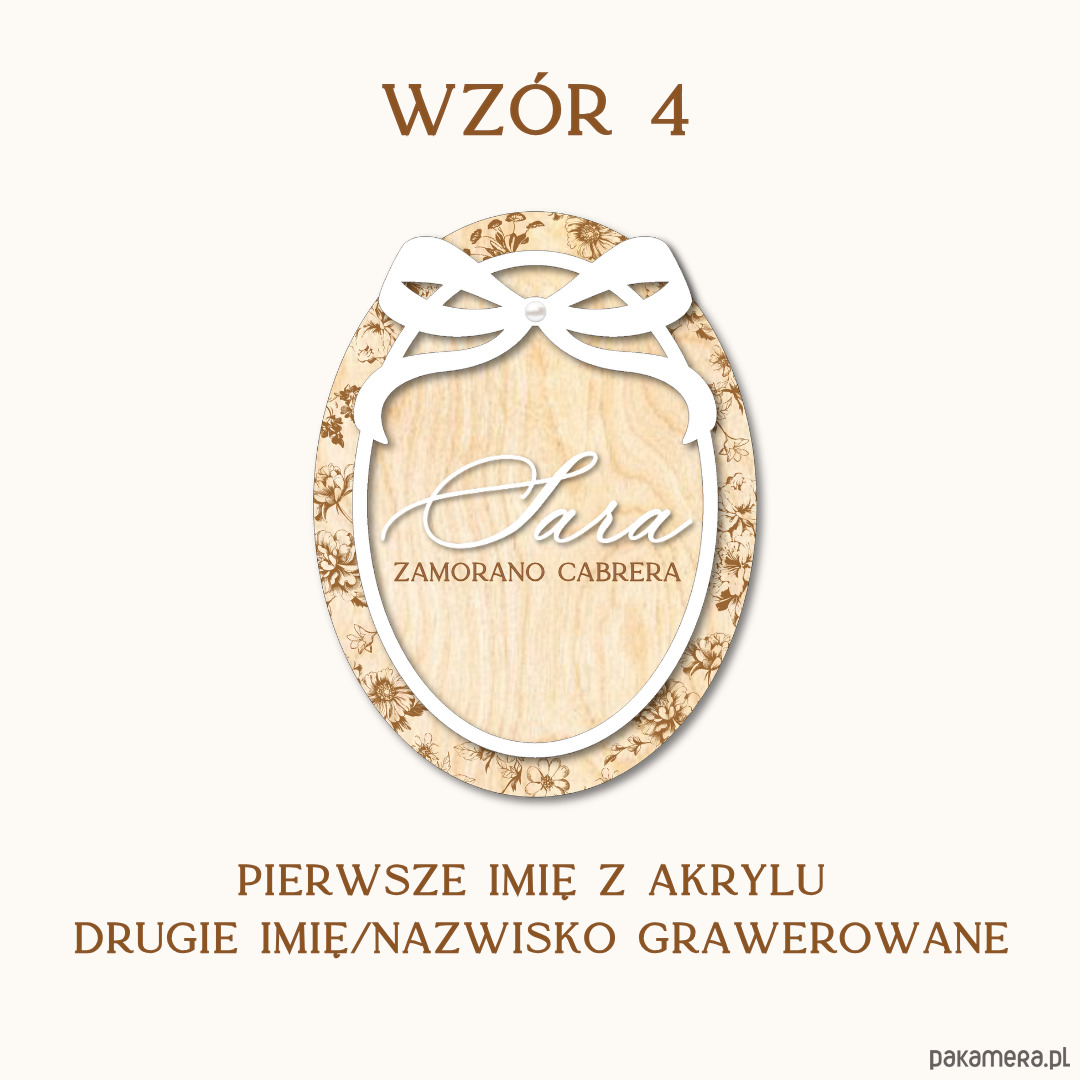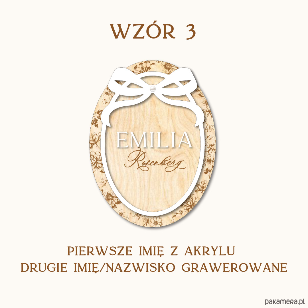 • Wzór 3 i 4: imię wycięte z białego akrylu, drugie imię/nazwisko grawerowane