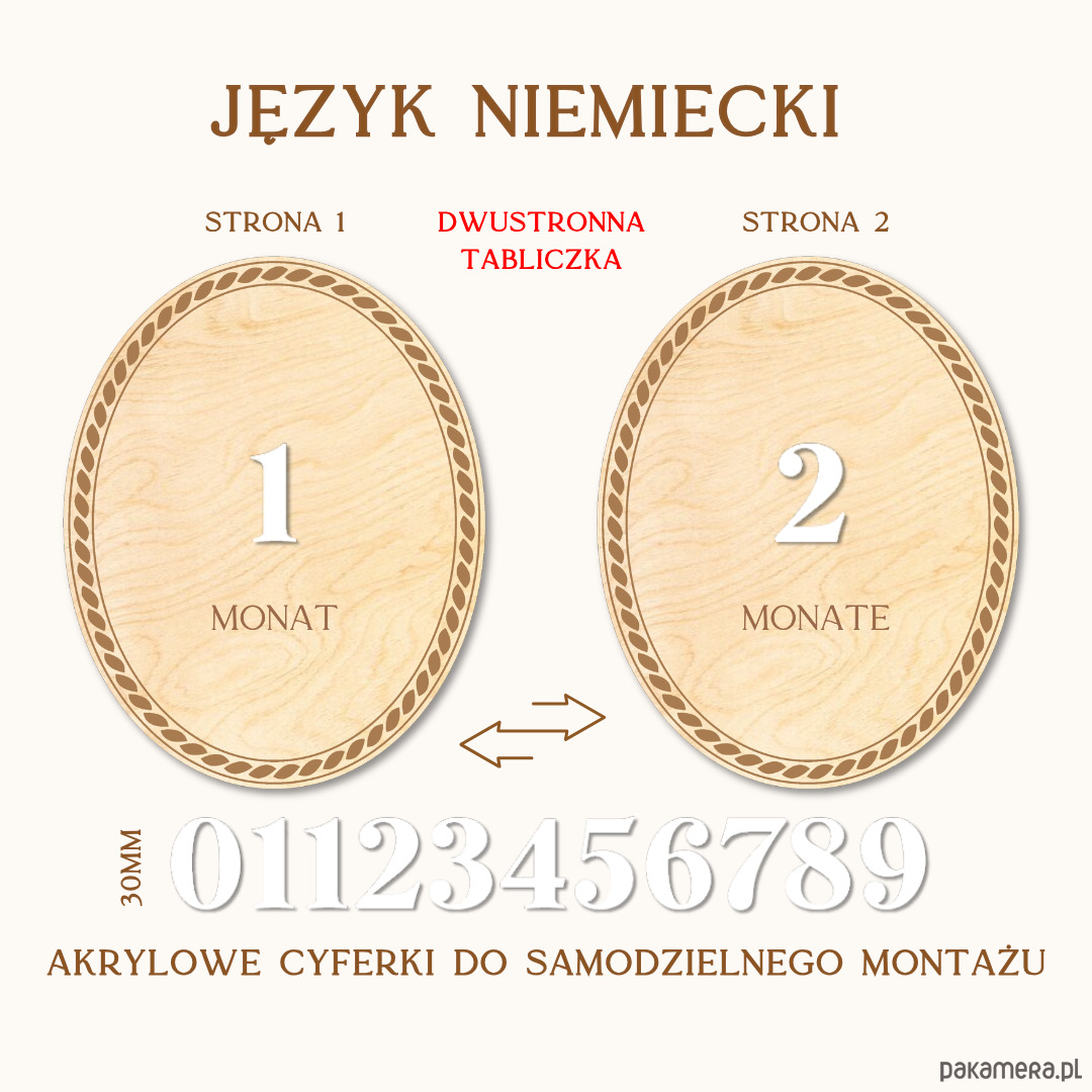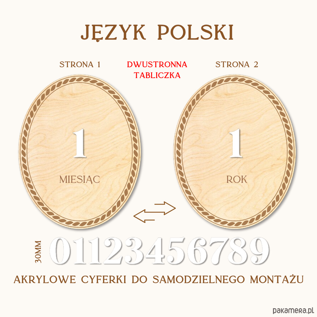 • Tabliczka jest DWUSTRONNA: na jednej stronie wygrawerowany "miesiąc", na drugiej "rok w przypadku języka polskiego. W innych językach tak jak pokazano na grafikach.