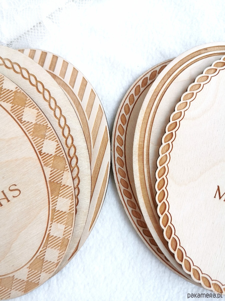 Tabliczka została precyzyjnie wygrawerowana w naturalnym drewnie brzozowym i uzupełniona białymi akrylowymi cyframi, które można swobodnie wymieniać. Delikatna, szyfonowa wstążka dodaje całości romantycznego charakteru i sprawia, że każdy kadr wygląda wyjątkowo.