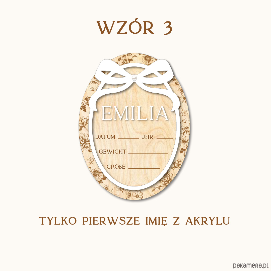 • Wzór 3 i 4: imię wycięte z białego akrylu, drugie imię/nazwisko grawerowane