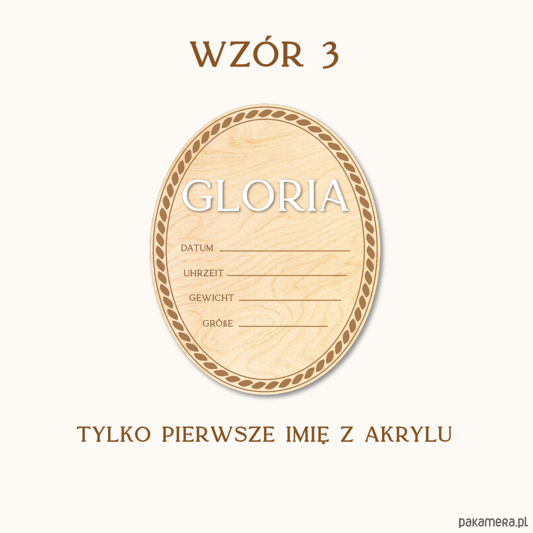 • Wzór 3 i 4: imię wycięte z białego akrylu, drugie imię/nazwisko grawerowane