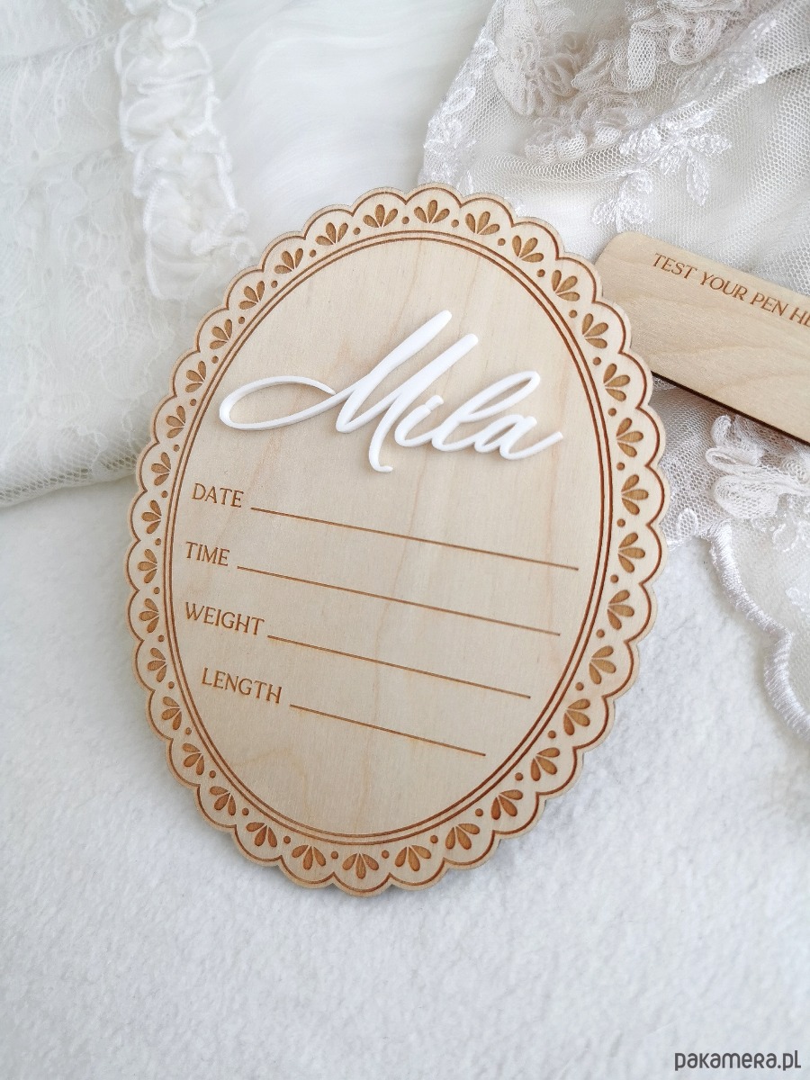 Tabliczka pozwala własnoręcznie uzupełnić najważniejsze informacje o narodzinach dziecka, tworząc wzruszającą pamiątkę na lata.