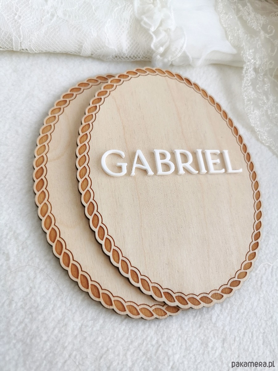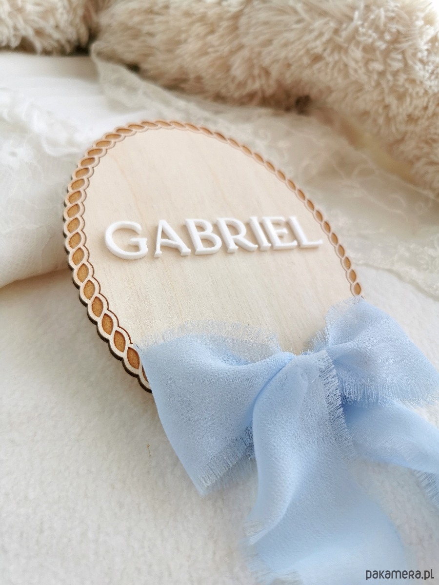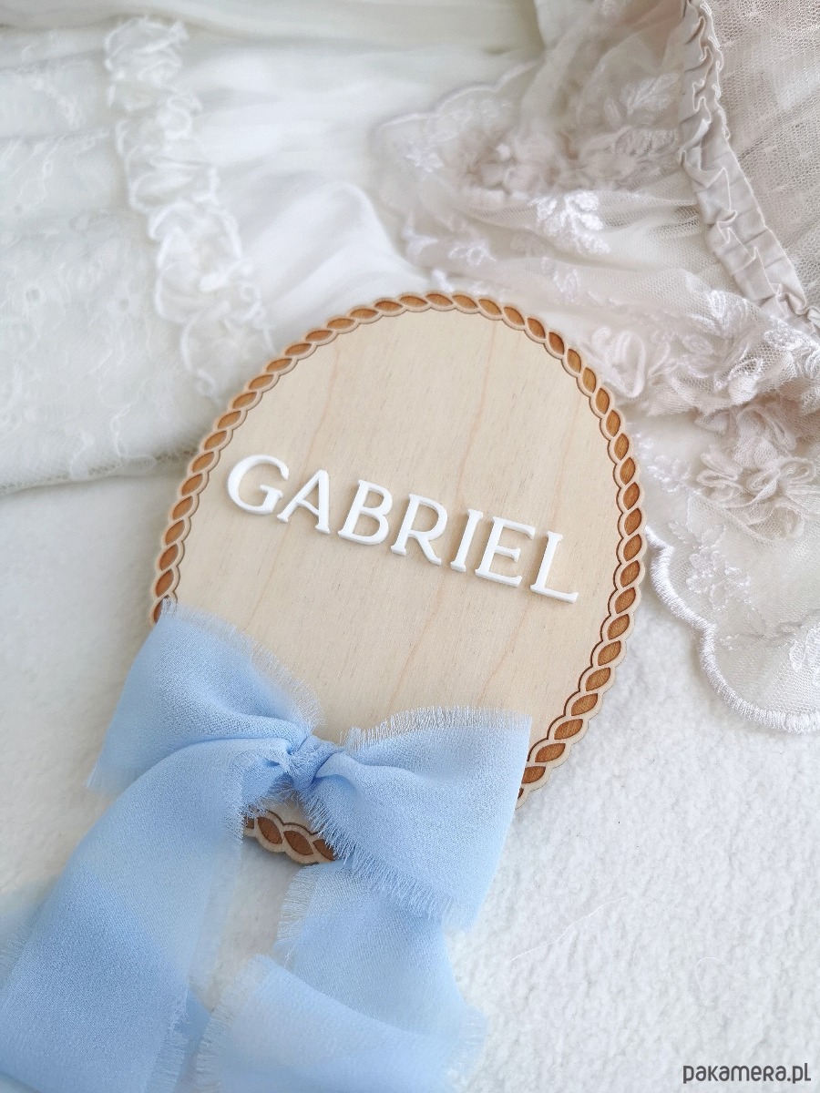 Powitaj swoje maleństwo w najpiękniejszy możliwy sposób dzięki personalizowanej tabliczce z imieniem — subtelnemu i pełnemu czułości dodatku, który zamienia pierwsze chwile życia dziecka w ponadczasową pamiątkę. Idealnie sprawdzi się podczas pierwszych zdjęć w szpitalu, sesji noworodkowych oraz jako dekoracja pokoju dziecięcego. Imię dziecka wykonane jest z białego akrylu w formie eleganckich, wypukłych liter, które pięknie kontrastują z naturalnym drewnem i przyciągają wzrok swoją lekkością. Całość dopełnia delikatna szyfonowa wstążka, nadająca tabliczce klasyczny, spokojny i harmonijny charakter.
