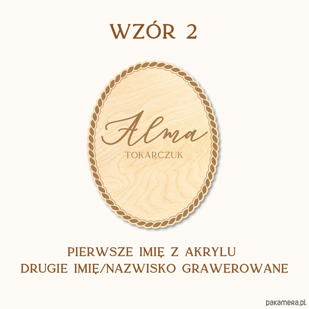 • Wzór 3 i 4: imię wycięte z białego akrylu, drugie imię/nazwisko grawerowane