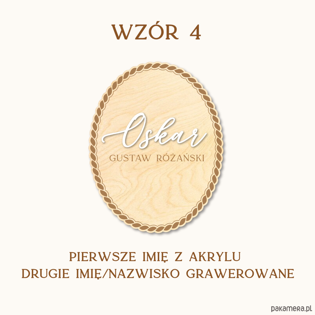 • Wzór 3 i 4: imię wycięte z białego akrylu, drugie imię/nazwisko grawerowane