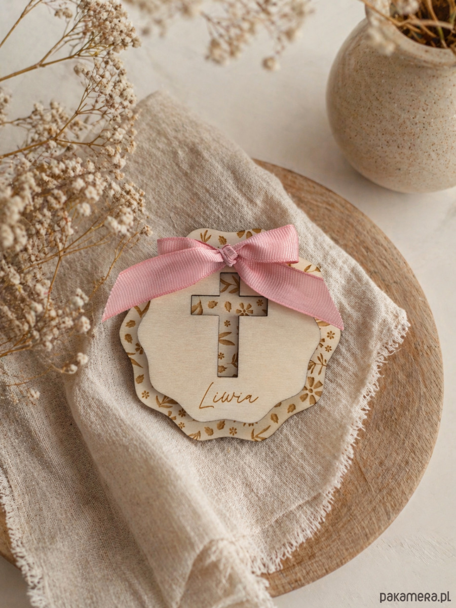 Delikatna, drewniana tabliczka z subtelnym motywem krzyża, piękna pamiątka na najważniejsze sakramenty- Chrzest Święty, Pierwszą Komunię czy Bierzmowanie. Starannie wykonana, ozdobiona uroczą kokardką, idealnie wpisuje się w estetykę naturalnej elegancji.