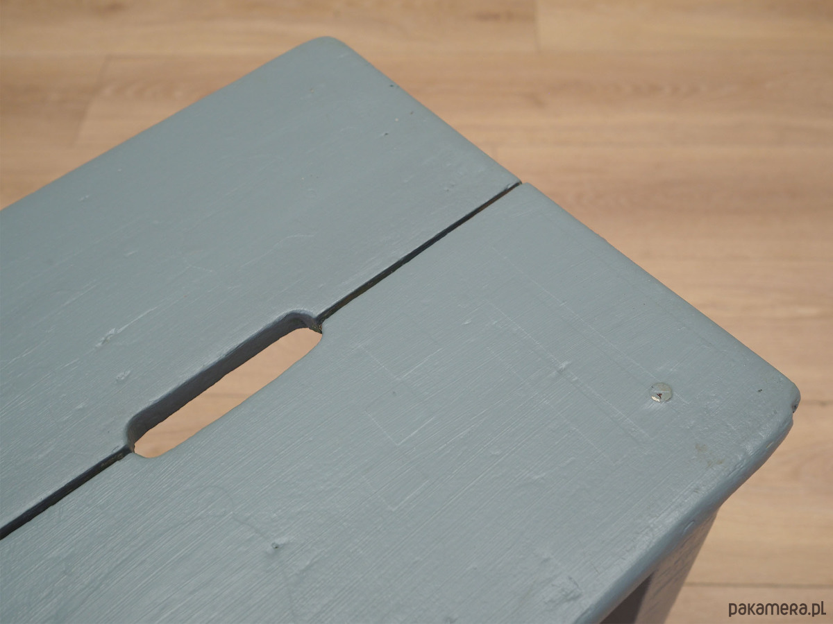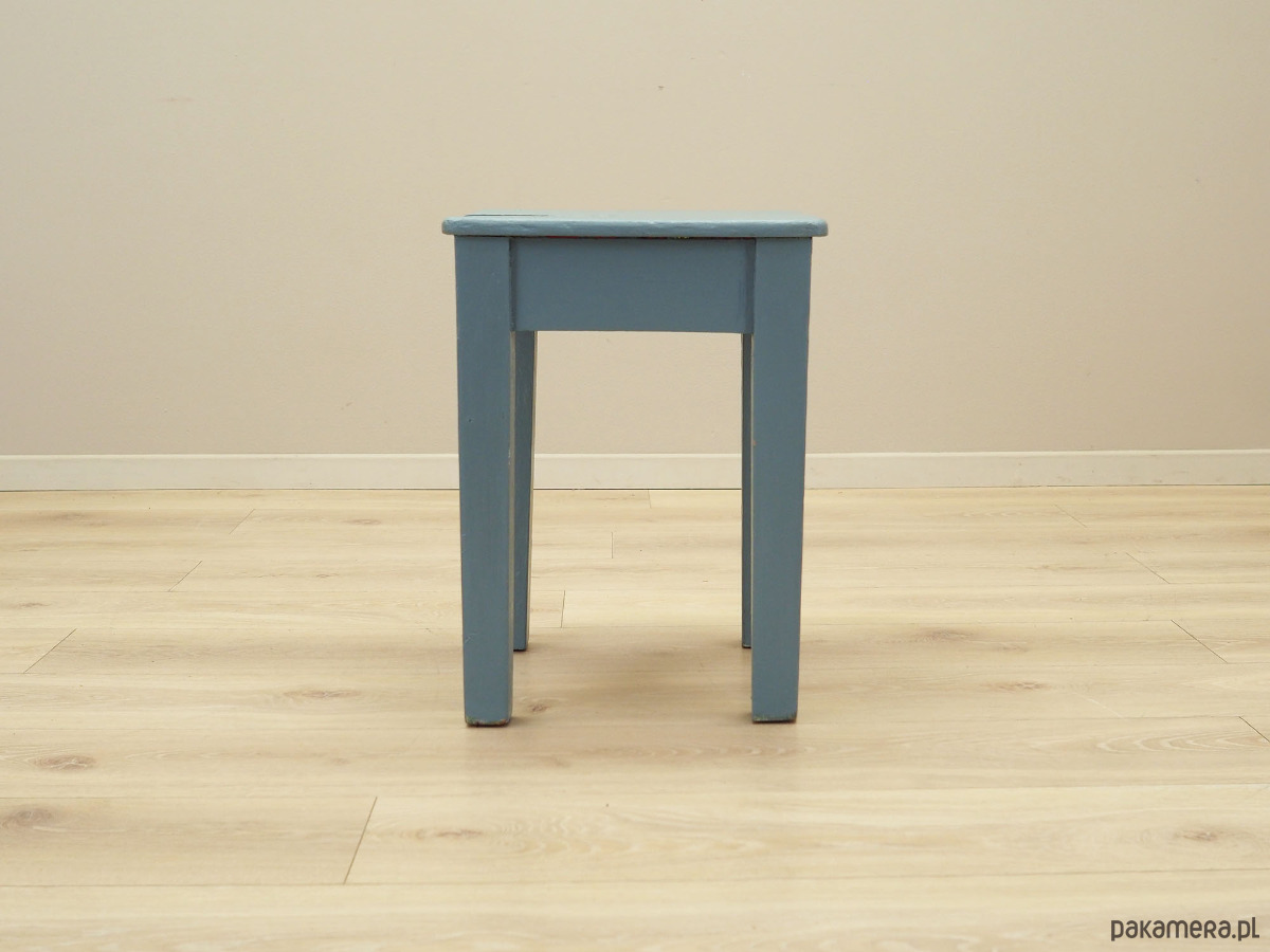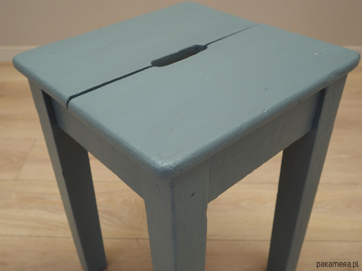Wykonany został z litego drewna sosnowego. Taboret wybarwiony na kolor błękitny metodą shabby chic.