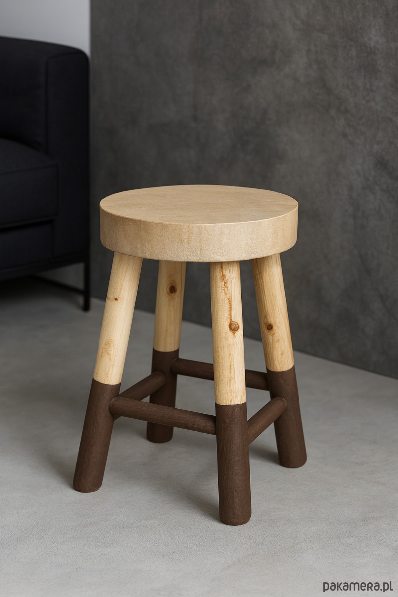 Stołek wykonany jest z drewna paulowni, jednego z najlżejszych i najbardziej estetycznych gatunków drewna w przemyśle meblarskim. Stołek był woskowany, dzięki czemu jest bardziej odporny na zarysowania i oraz jest wodoodporny.