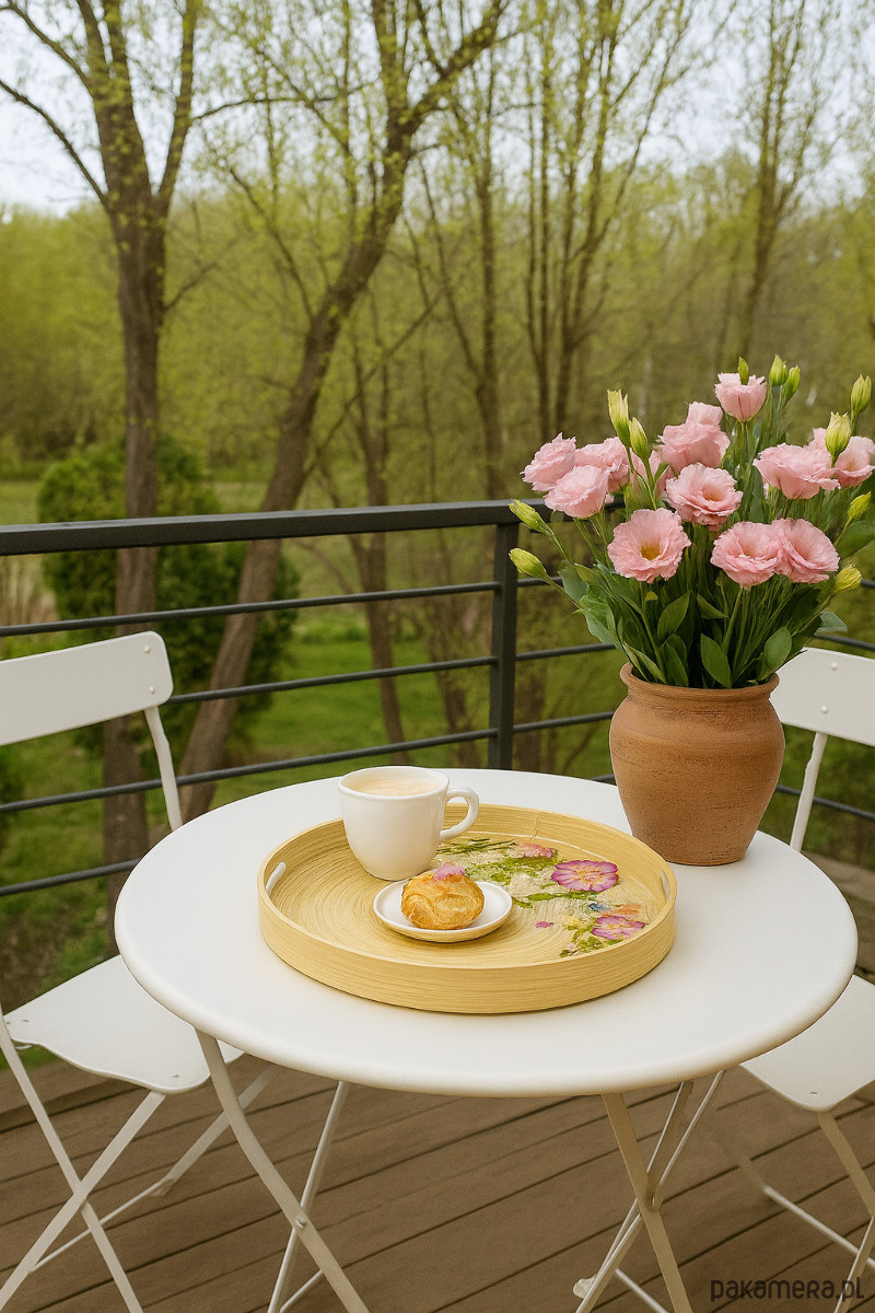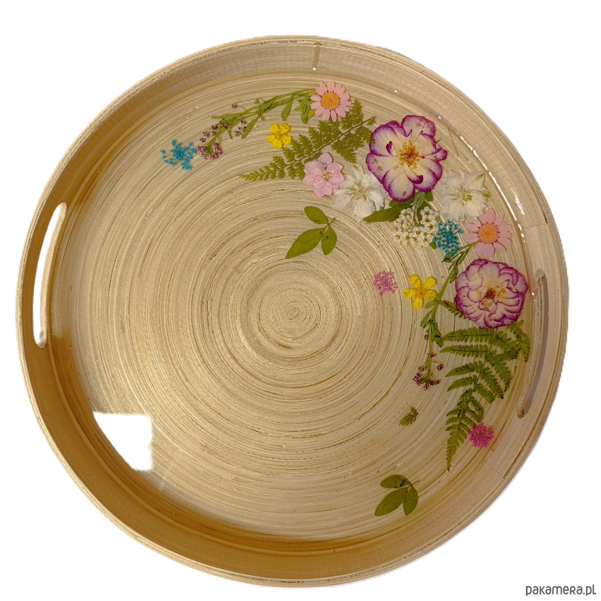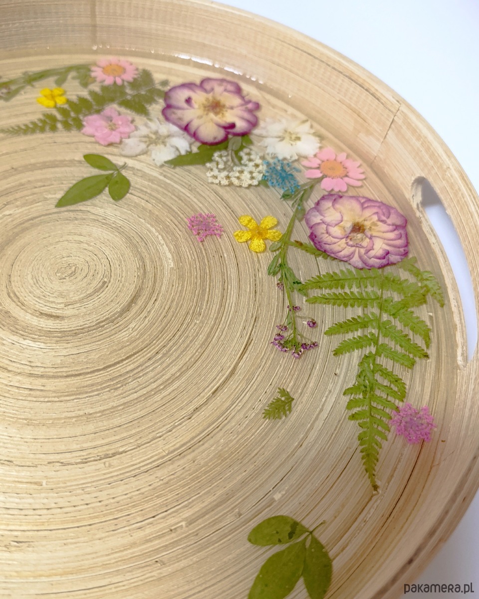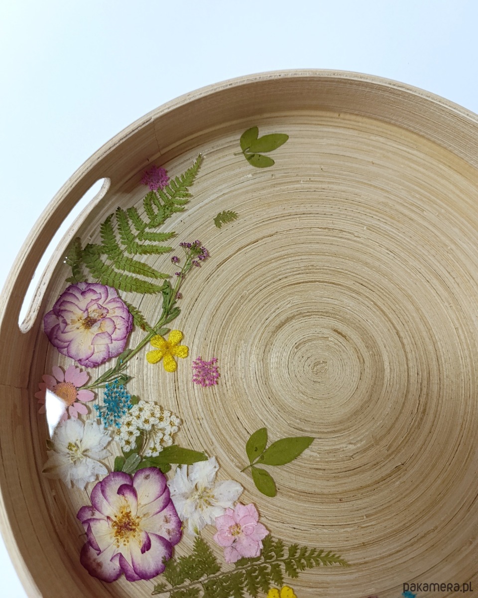 Elegancka, okrągła taca dekoracyjna wykonana ręcznie z naturalnej bazy i zabezpieczona wysokiej jakości żywicą epoksydową. Wnętrze tacy zdobi kompozycja prawdziwych, suszonych kwiatów i roślin, starannie zatopionych w żywicy, dzięki czemu zachowują swój kolor i delikatność na długie lata.