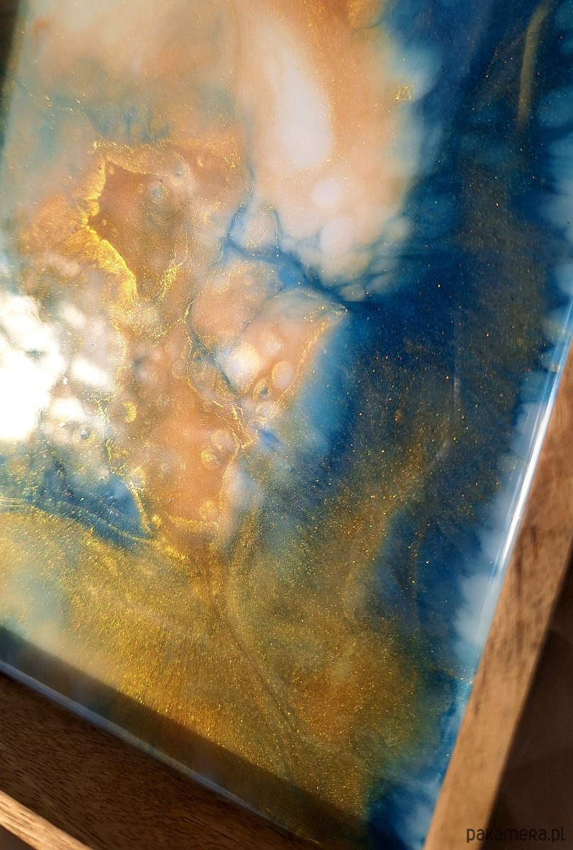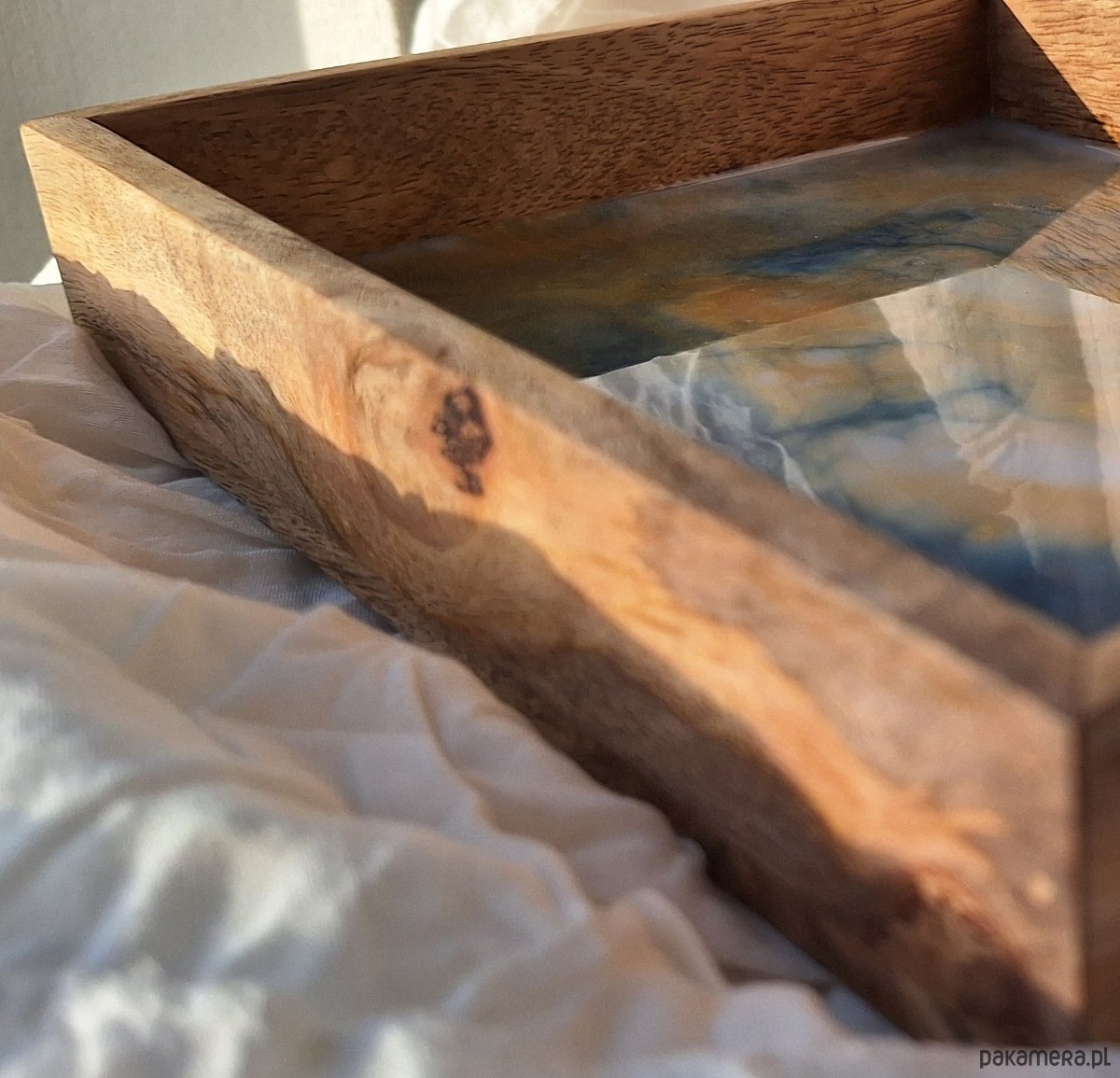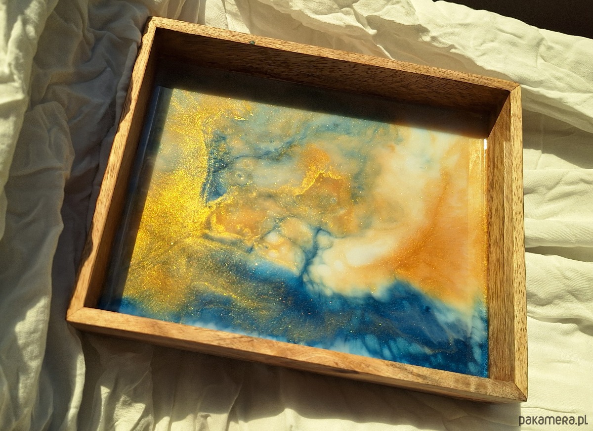 Środek tacy wypełnia mały, unikatowy obraz żywiczny "Złote piachy".