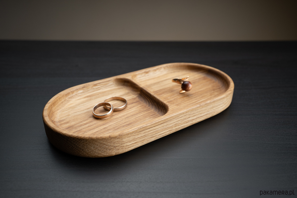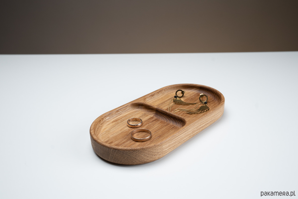 Ta aukcja oferuje drewnianą dębową tace biżuteryjną z dwiema przegrodami o wymiarach 10x20 cm.