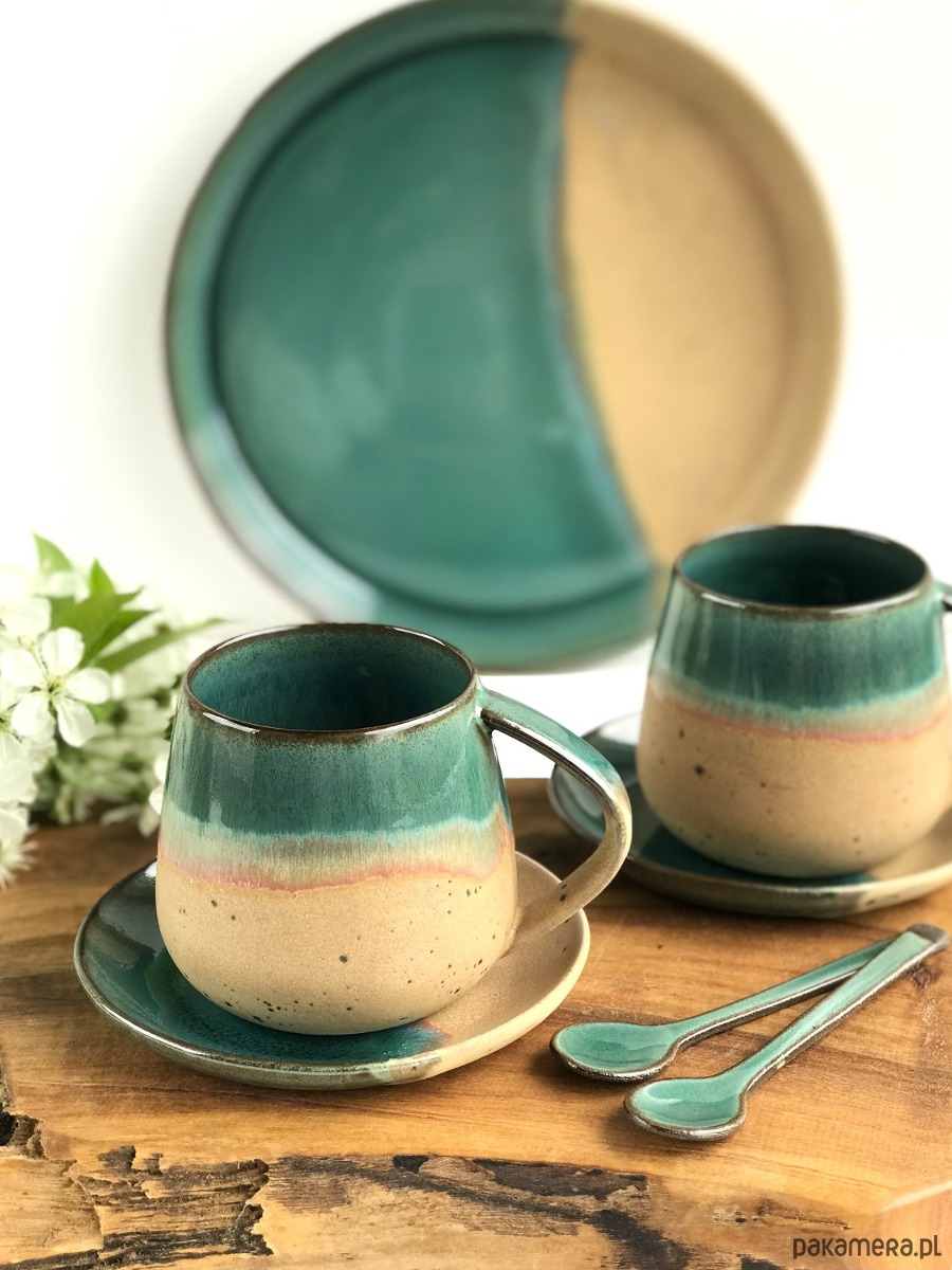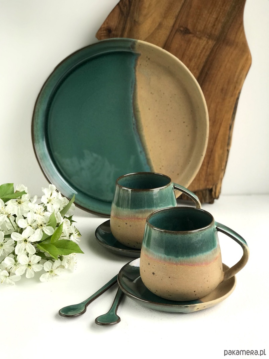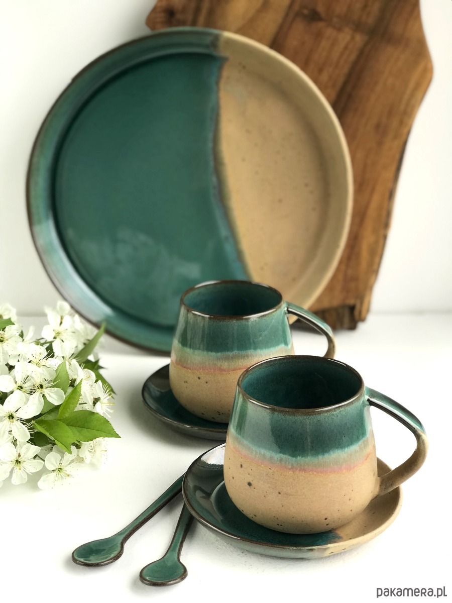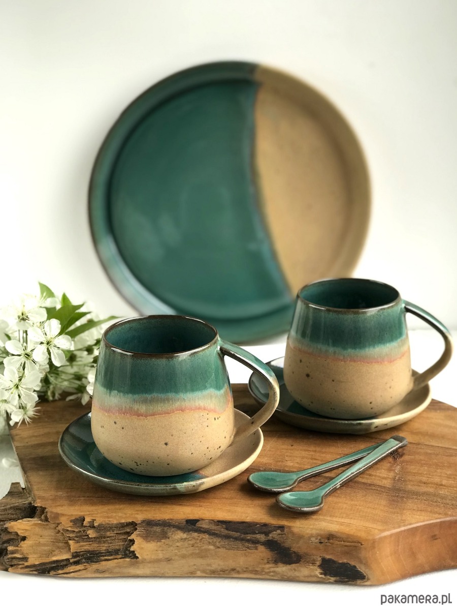Ręcznie formowana patera ceramiczna z wysokim rantem plus 2 wysokie filiżanki ceramiczne ze spodeczkami i ozdobnymi łyżeczkami.