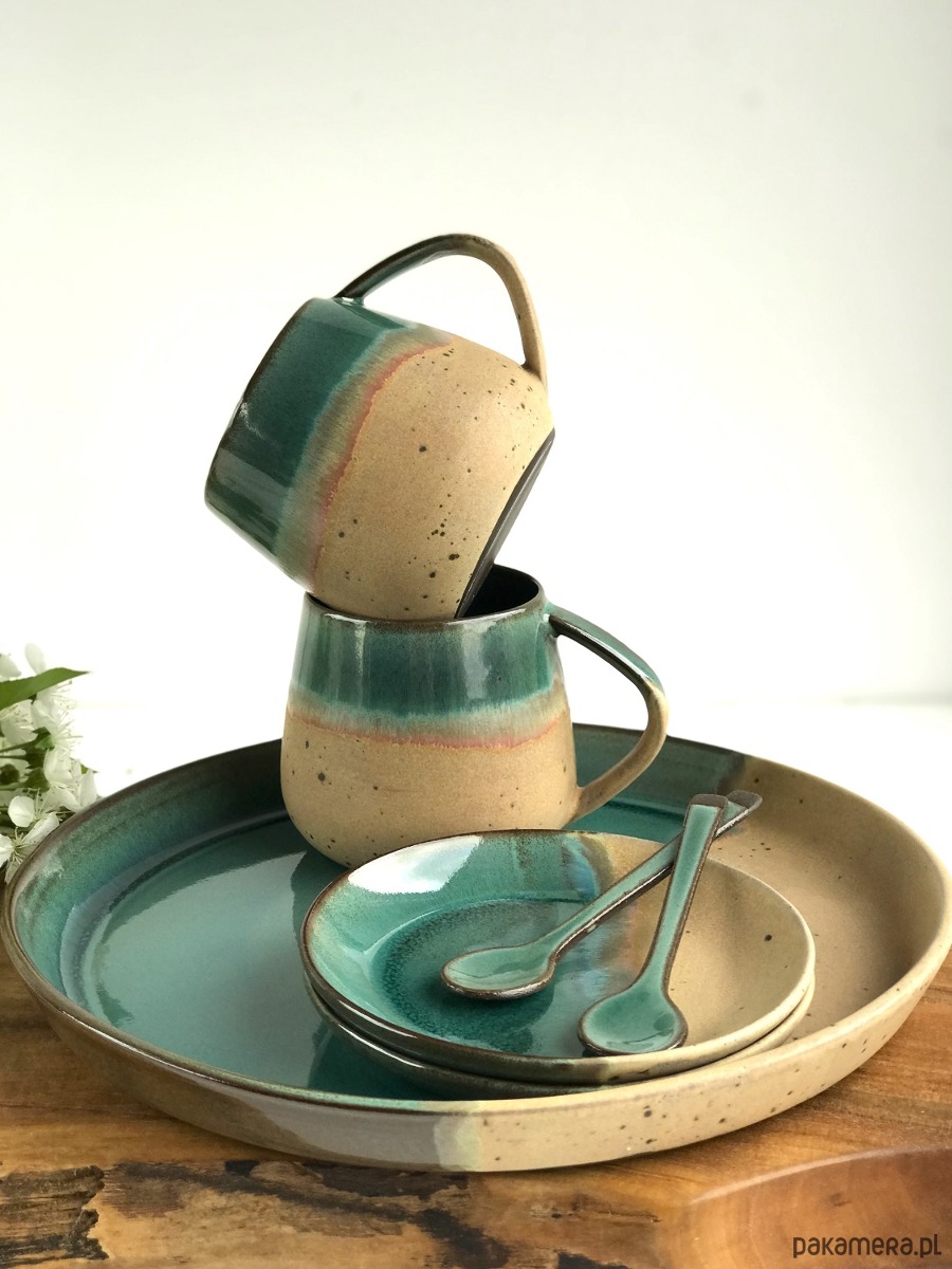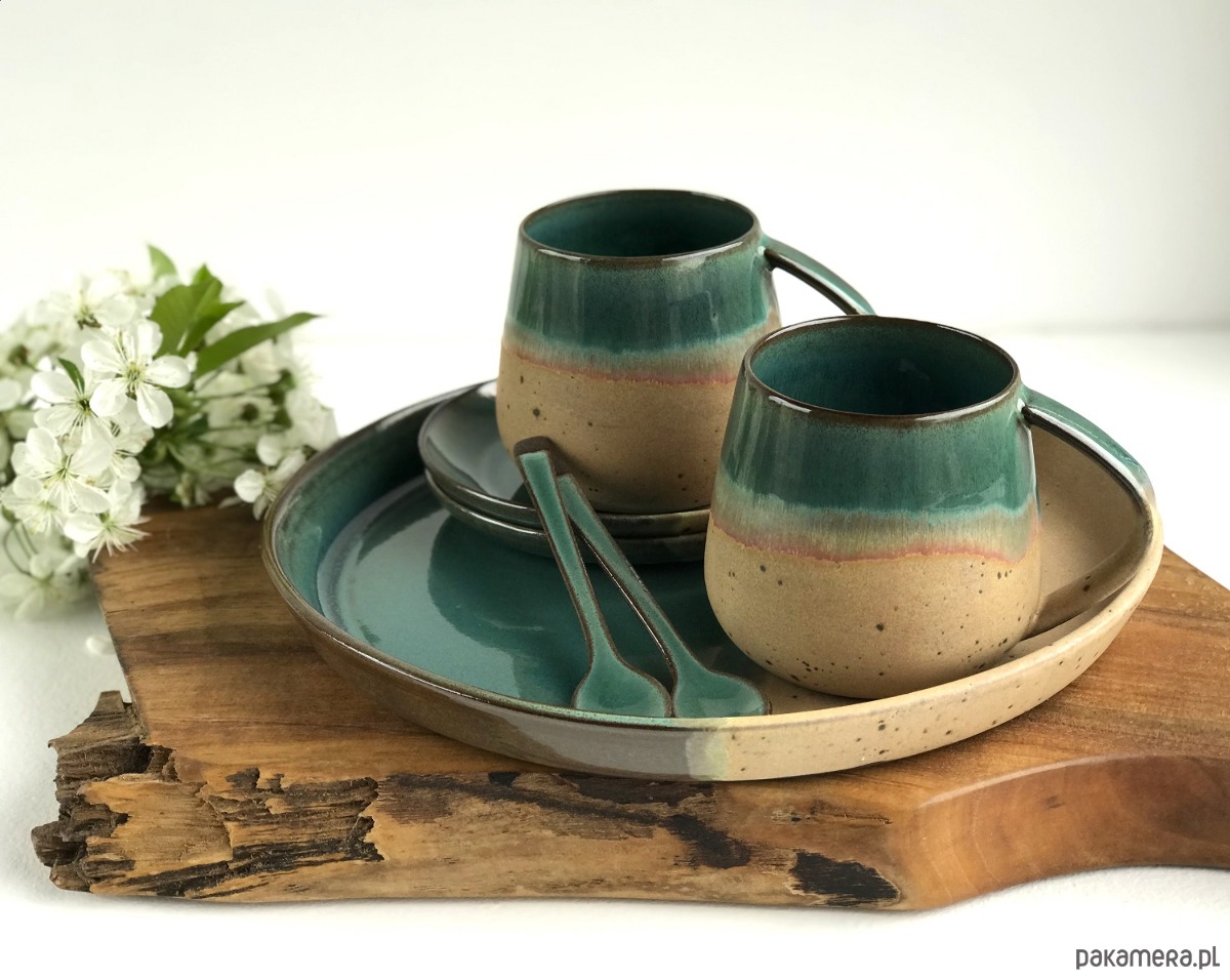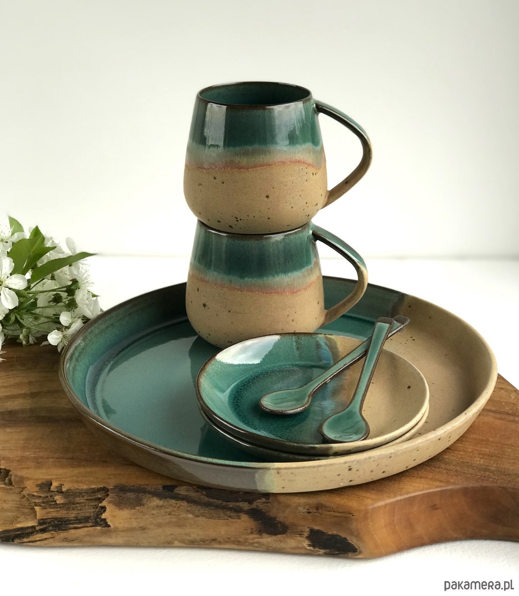 Ręcznie formowana patera ceramiczna z wysokim rantem plus 2 wysokie filiżanki ceramiczne ze spodeczkami i ozdobnymi łyżeczkami.