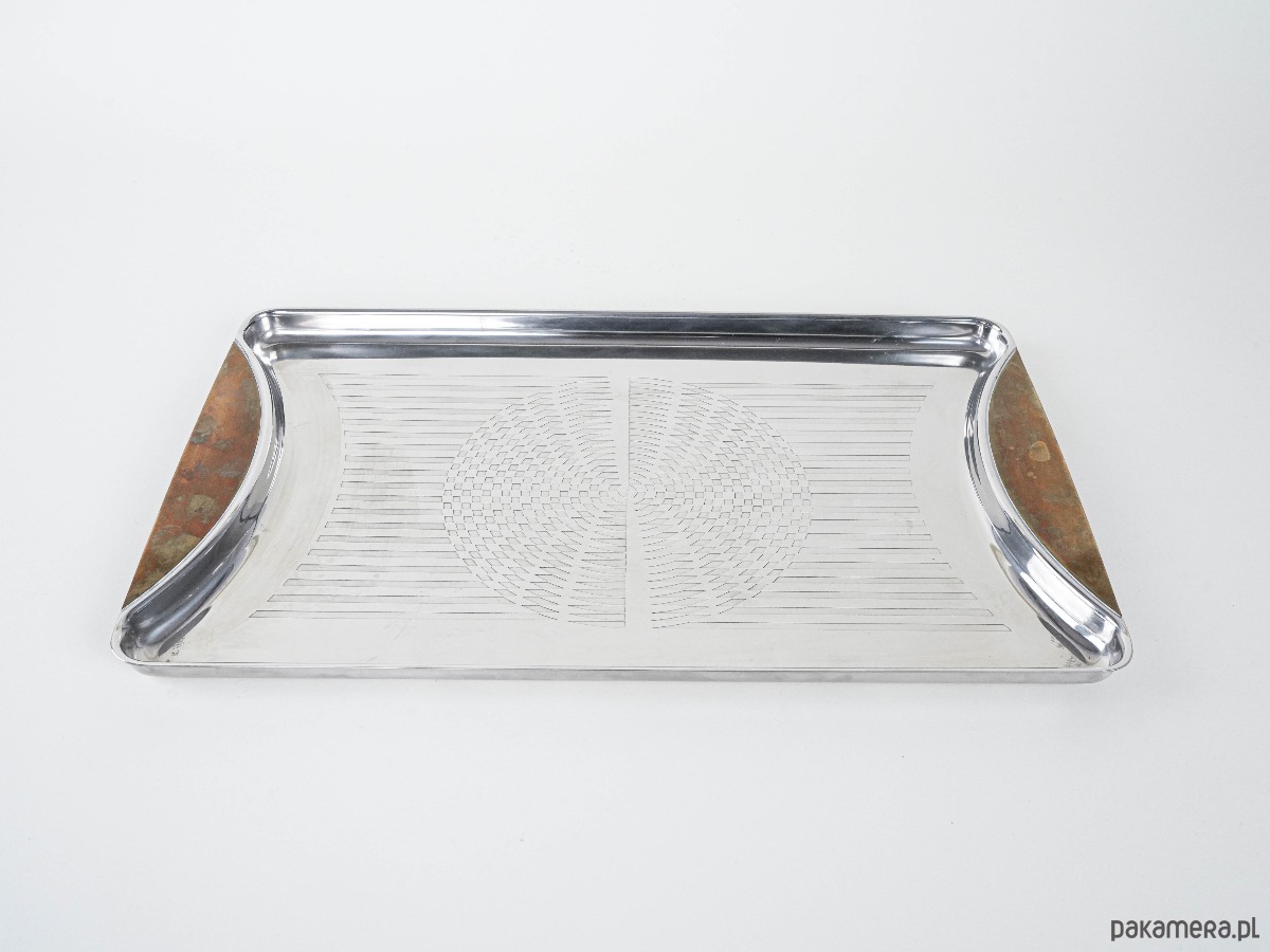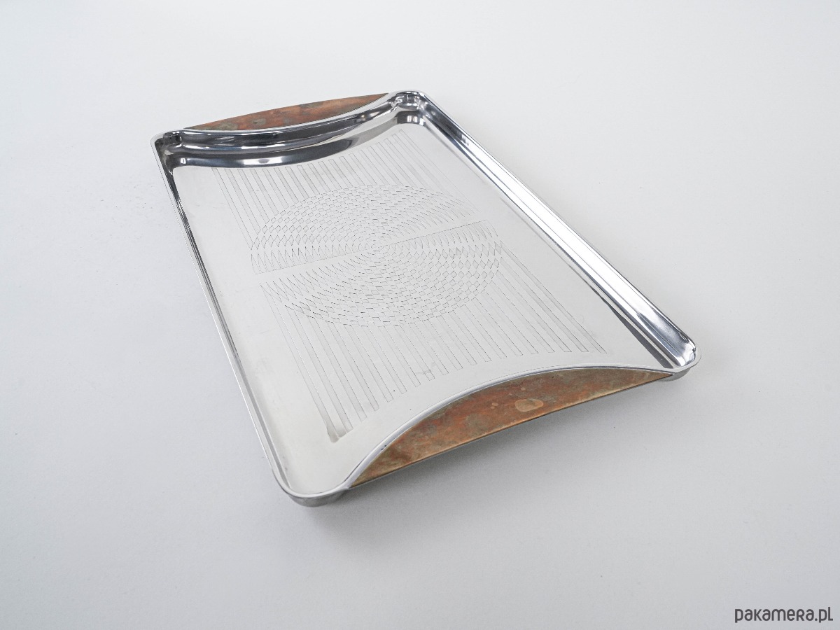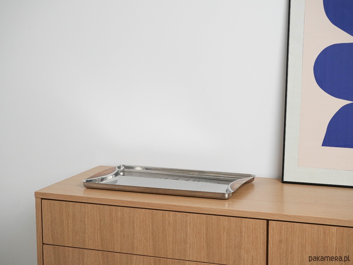Elegancka prostokątna forma wykonana ze stali nierdzewnej z dekoracyjnymi uchwytami w kolorze bursztynowym. Powierzchnia z grawerowanym geometrycznym wzorem nadaje całości wyrafinowanego charakteru. Idealna do serwowania kawy, herbaty, drinków lub jako element dekoracyjny w aranżacjach wnętrz w stylu Mid Century Modern.