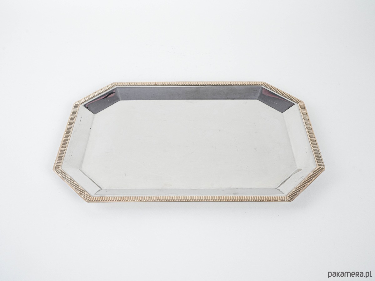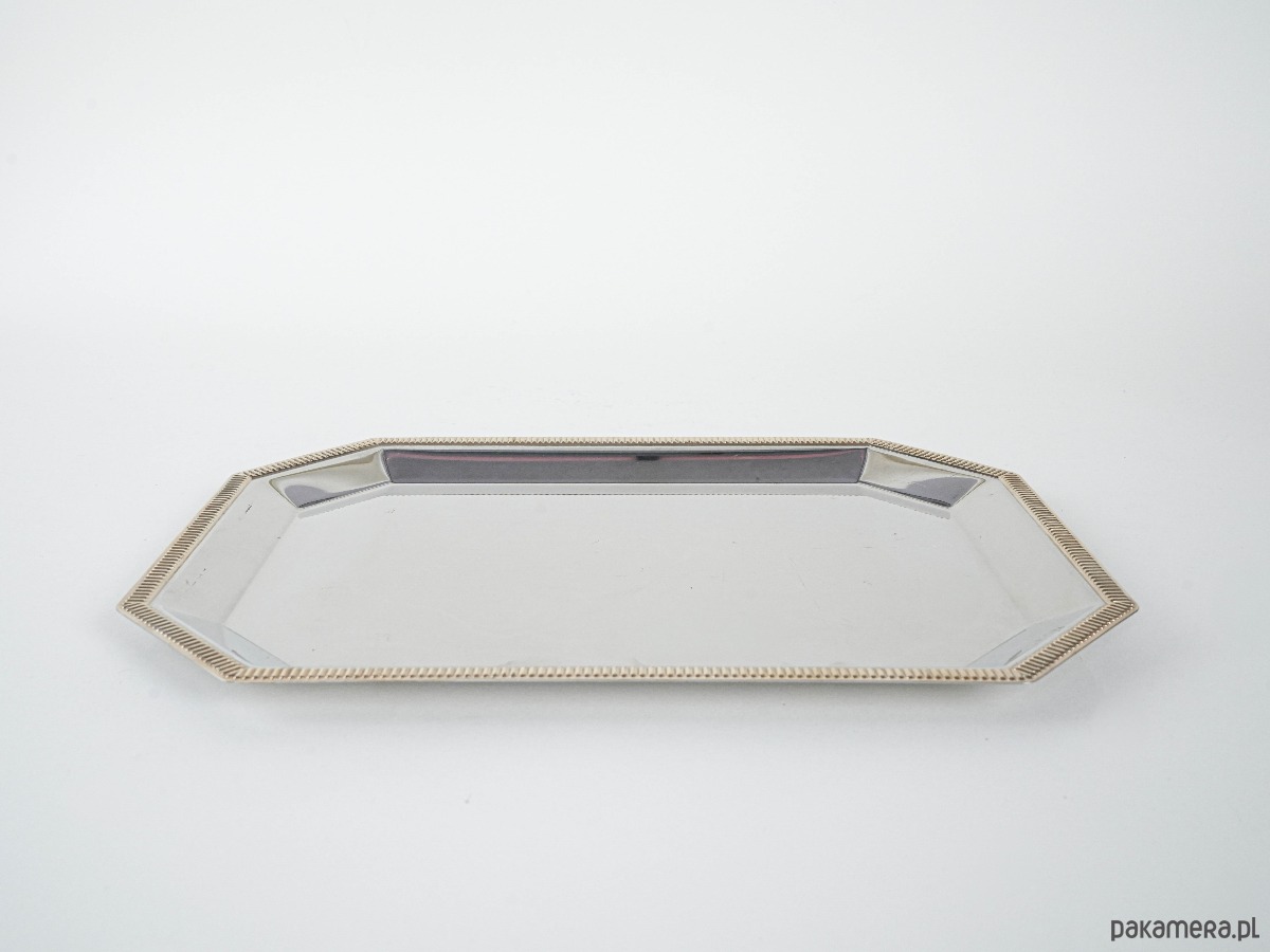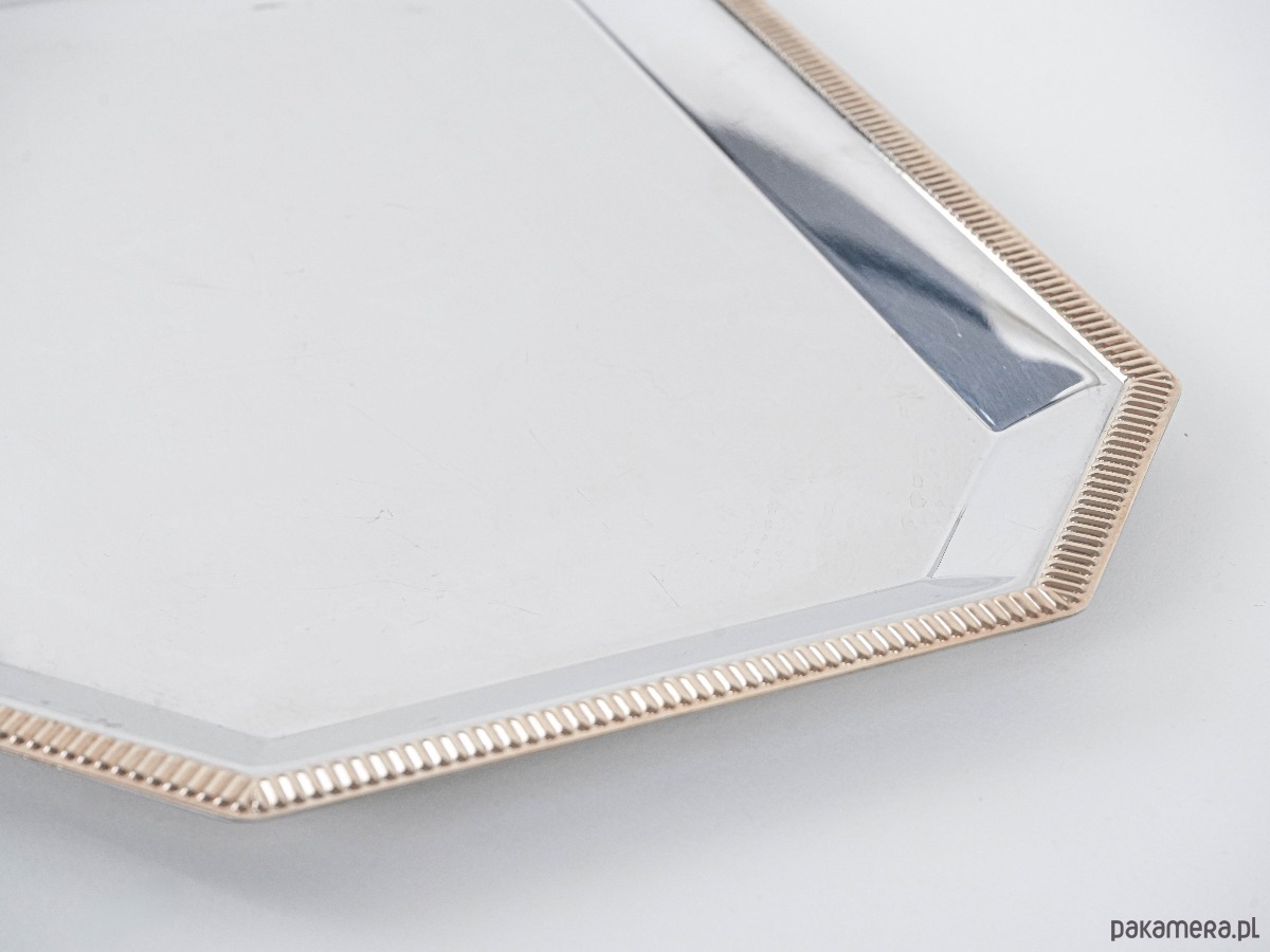 Wykonana ze stali nierdzewnej w formie ośmiokąta z dekoracyjną złoconą ramką o geometrycznym zdobieniu. Minimalistyczny, a zarazem elegancki design sprawia, że doskonale odnajdzie się zarówno w roli funkcjonalnej, jak i dekoracyjnej. Idealna do serwowania napojów, kawy lub jako ozdobny element w aranżacji wnętrz w stylu Mid Century Modern.