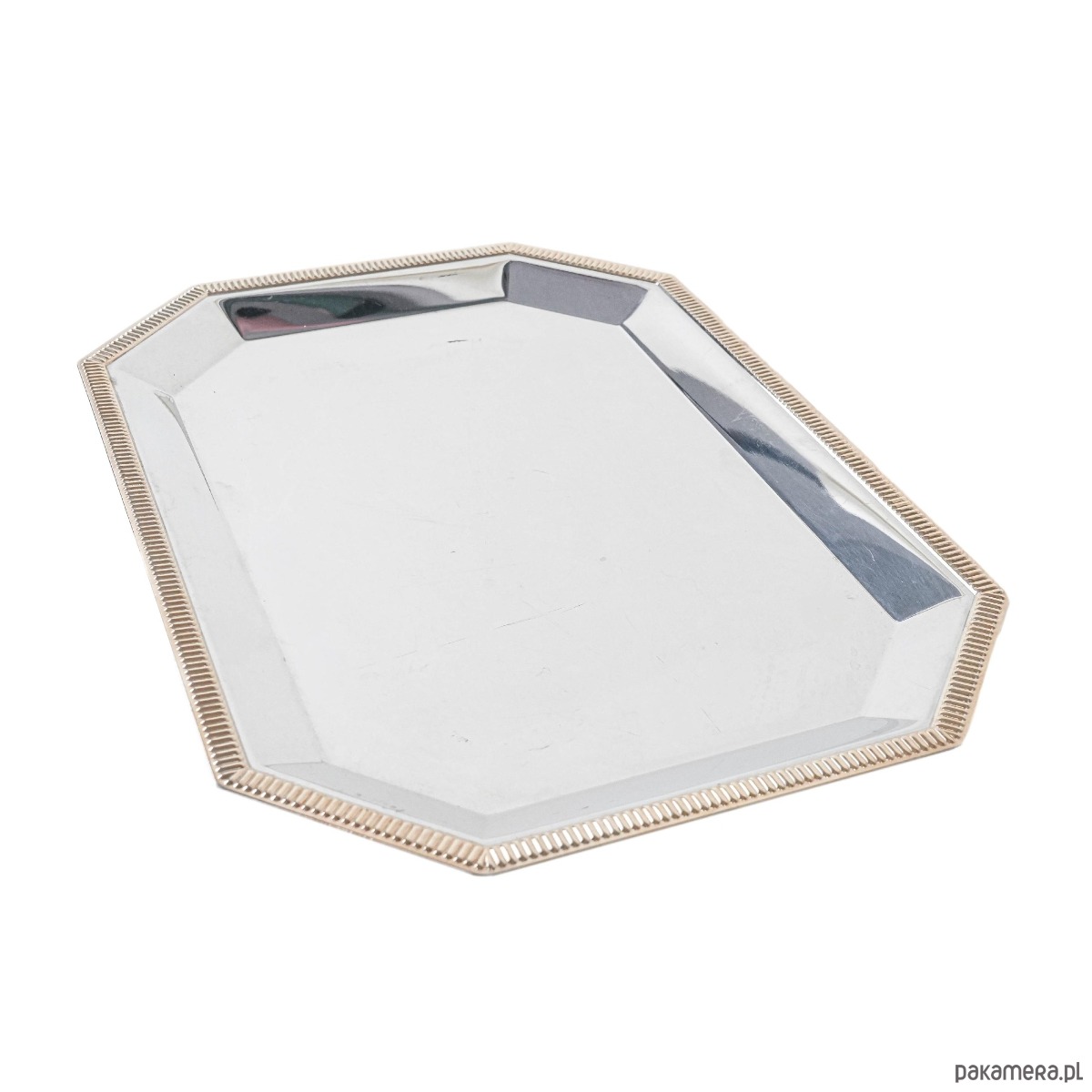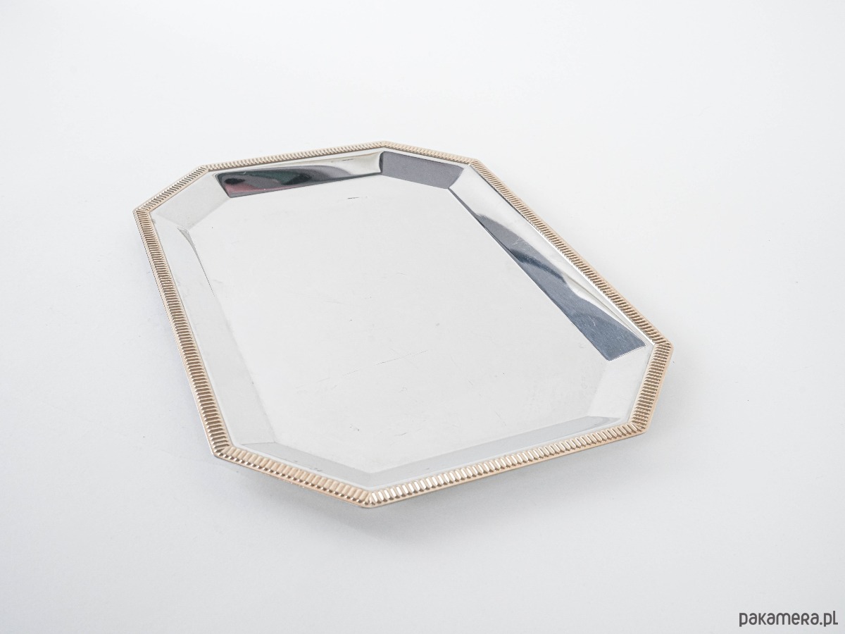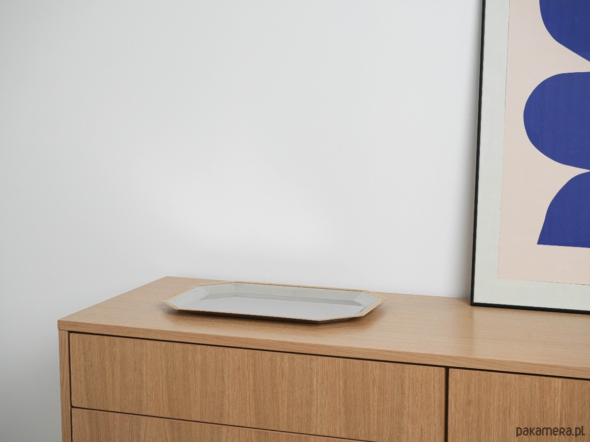 Wykonana ze stali nierdzewnej w formie ośmiokąta z dekoracyjną złoconą ramką o geometrycznym zdobieniu. Minimalistyczny, a zarazem elegancki design sprawia, że doskonale odnajdzie się zarówno w roli funkcjonalnej, jak i dekoracyjnej. Idealna do serwowania napojów, kawy lub jako ozdobny element w aranżacji wnętrz w stylu Mid Century Modern.