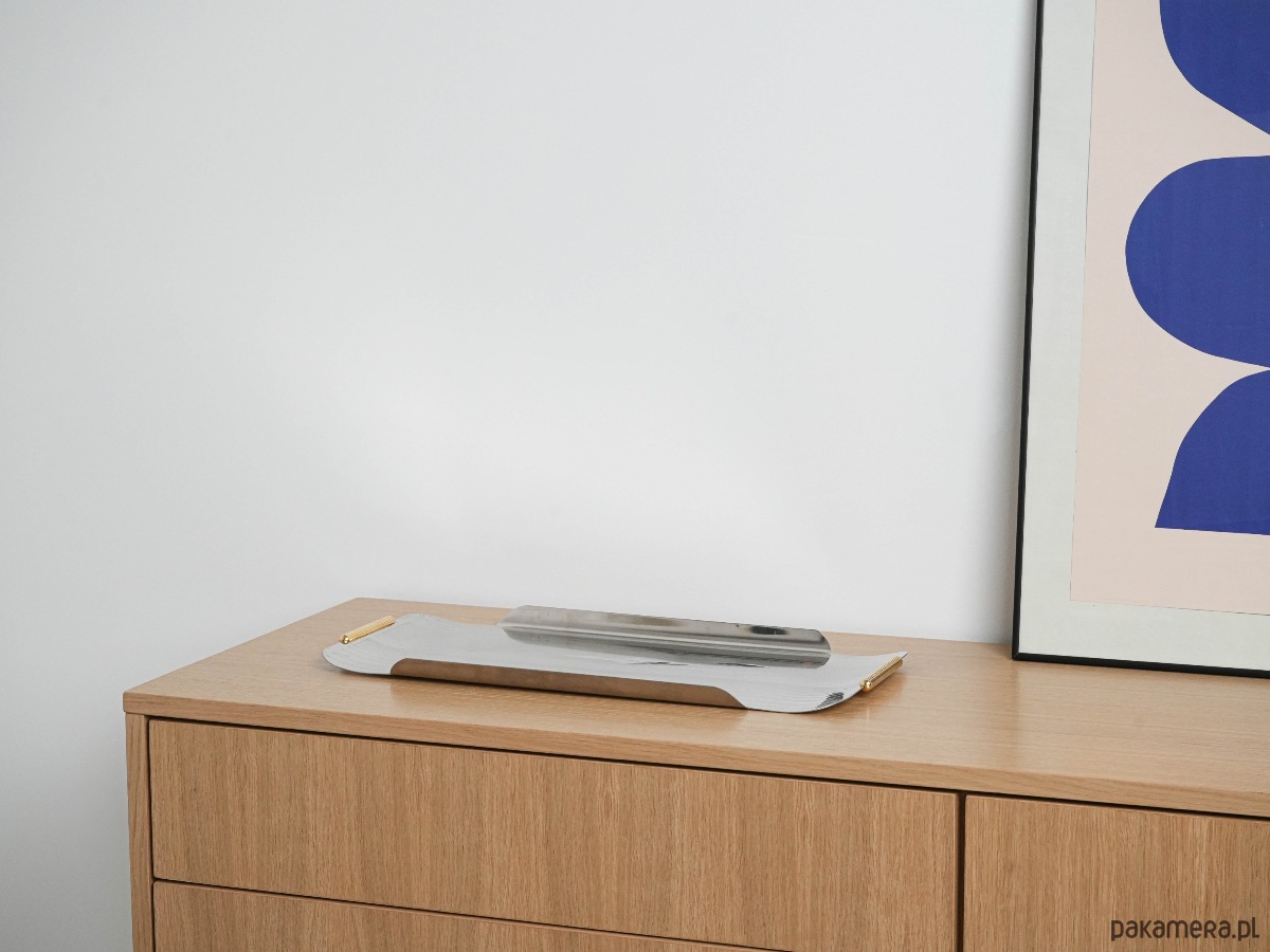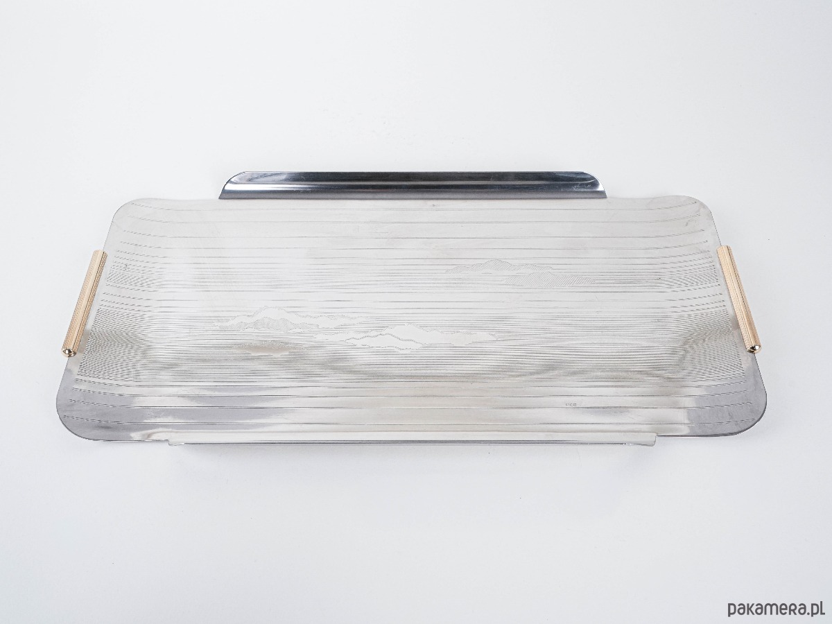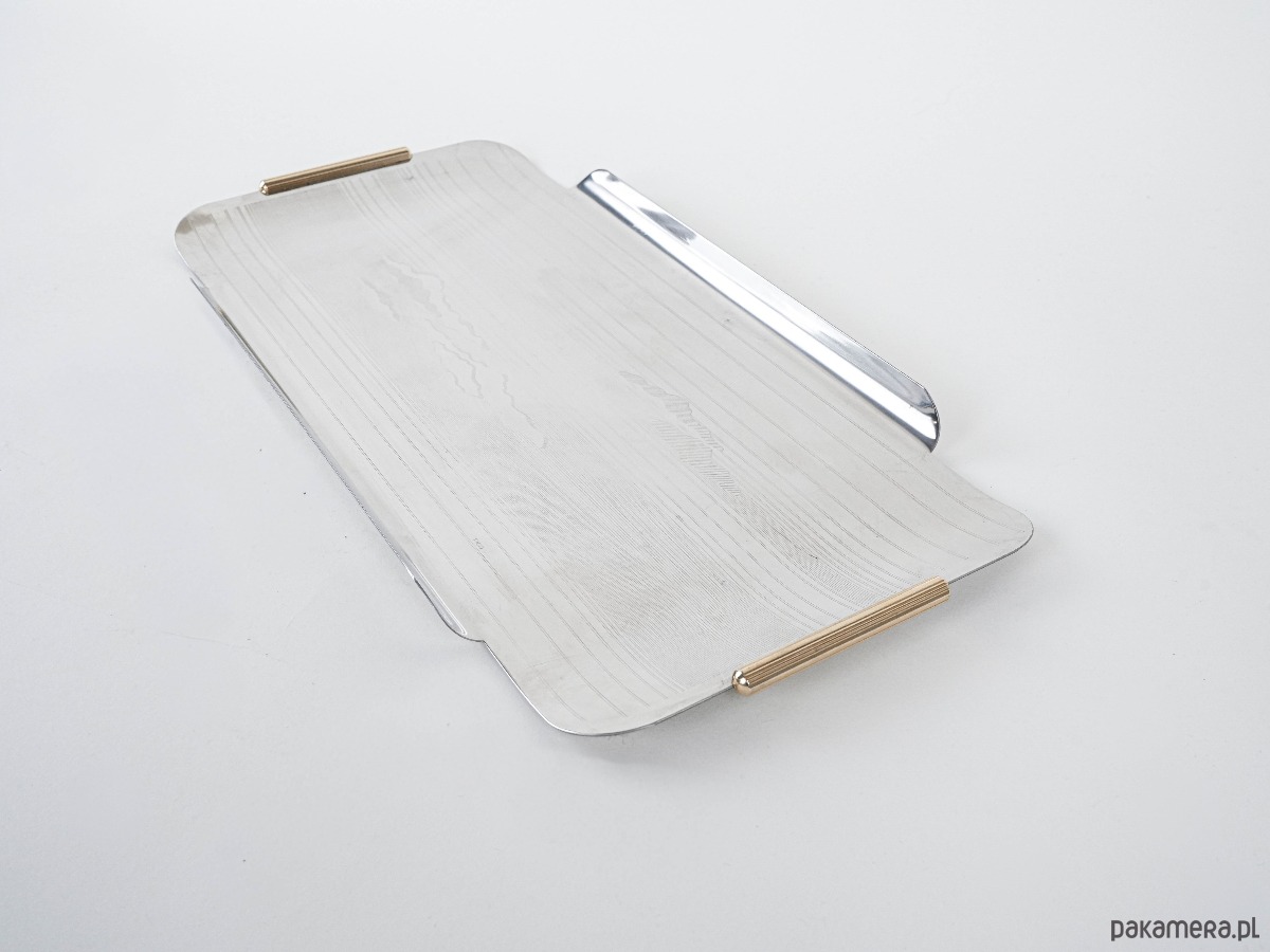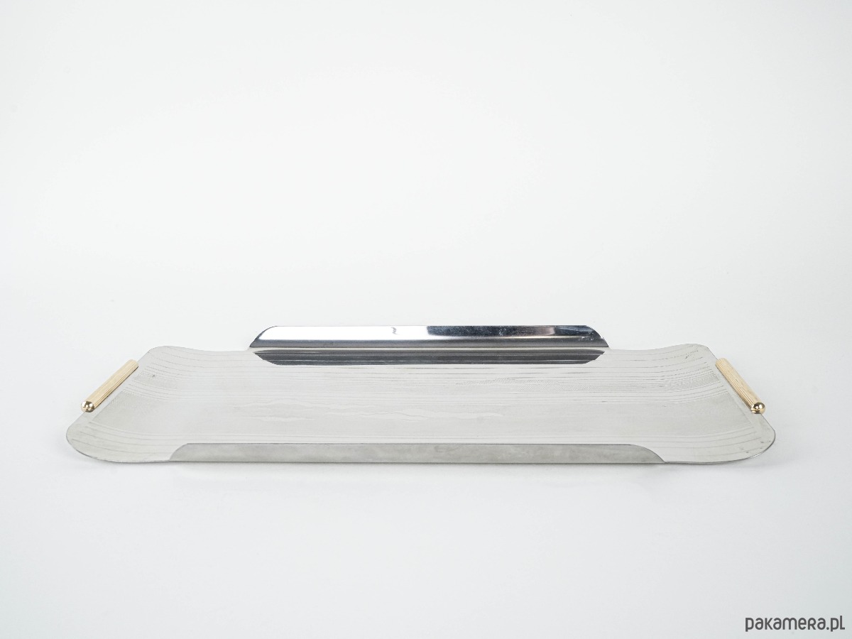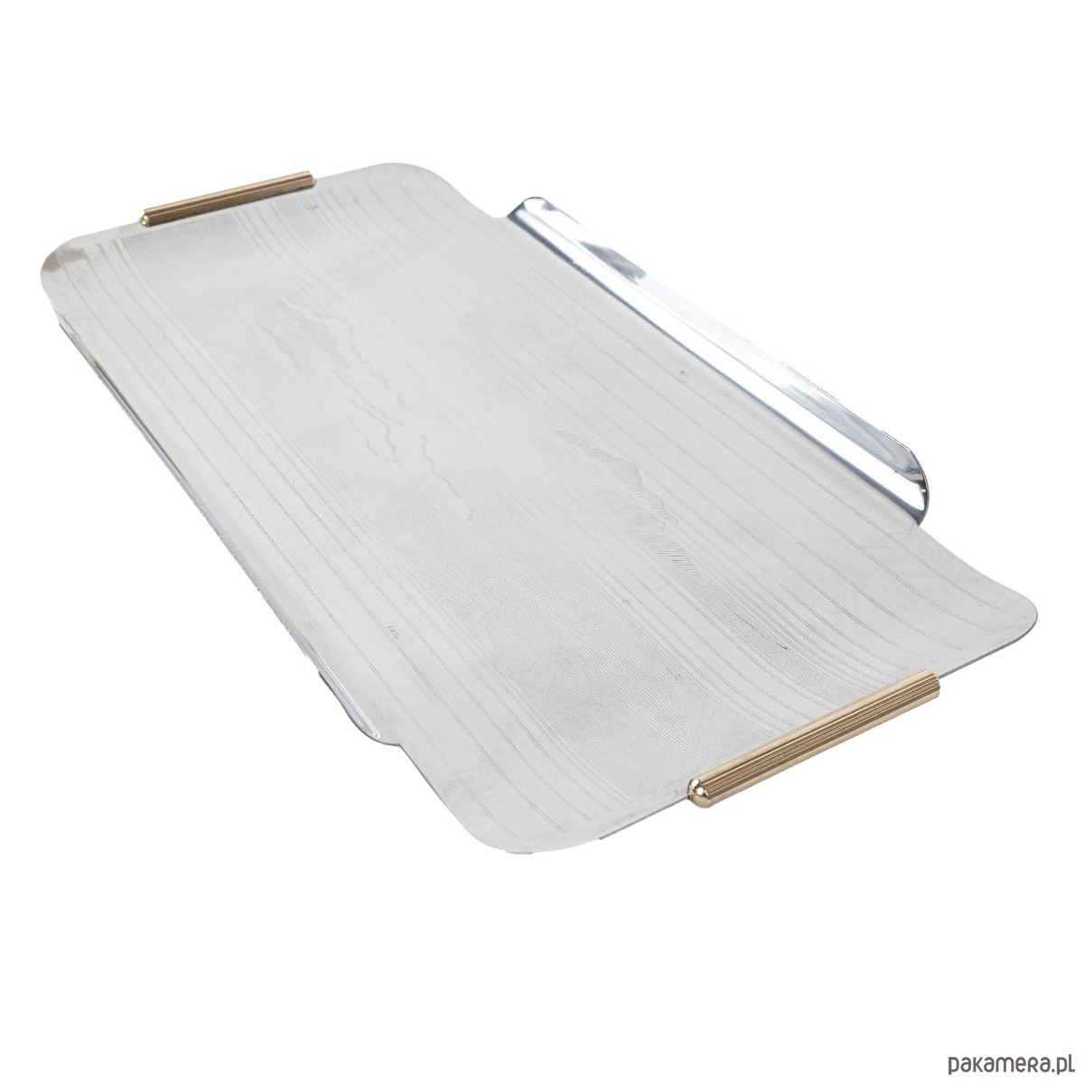 Taca serwingowa vintage, wykonana ze stali nierdzewnej w stylistyce Mid Century Modern. Posiada delikatne żłobienia dekoracyjne na powierzchni oraz eleganckie uchwyty w kolorze złotym. Prosta, minimalistyczna forma sprawia, że będzie pasować zarówno do nowoczesnych, jak i klasycznych wnętrz.