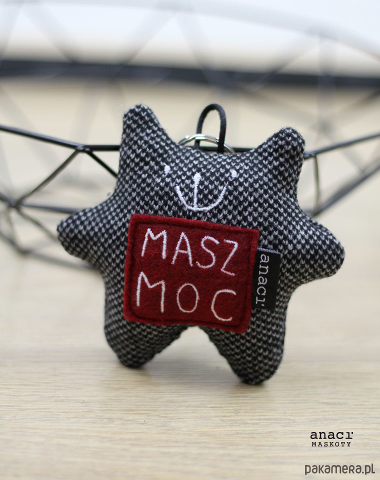 Wykonany z tkaniny tweedowej, zaopatrzony w filcową plakietkę z wyhaftowaną dedykacją.