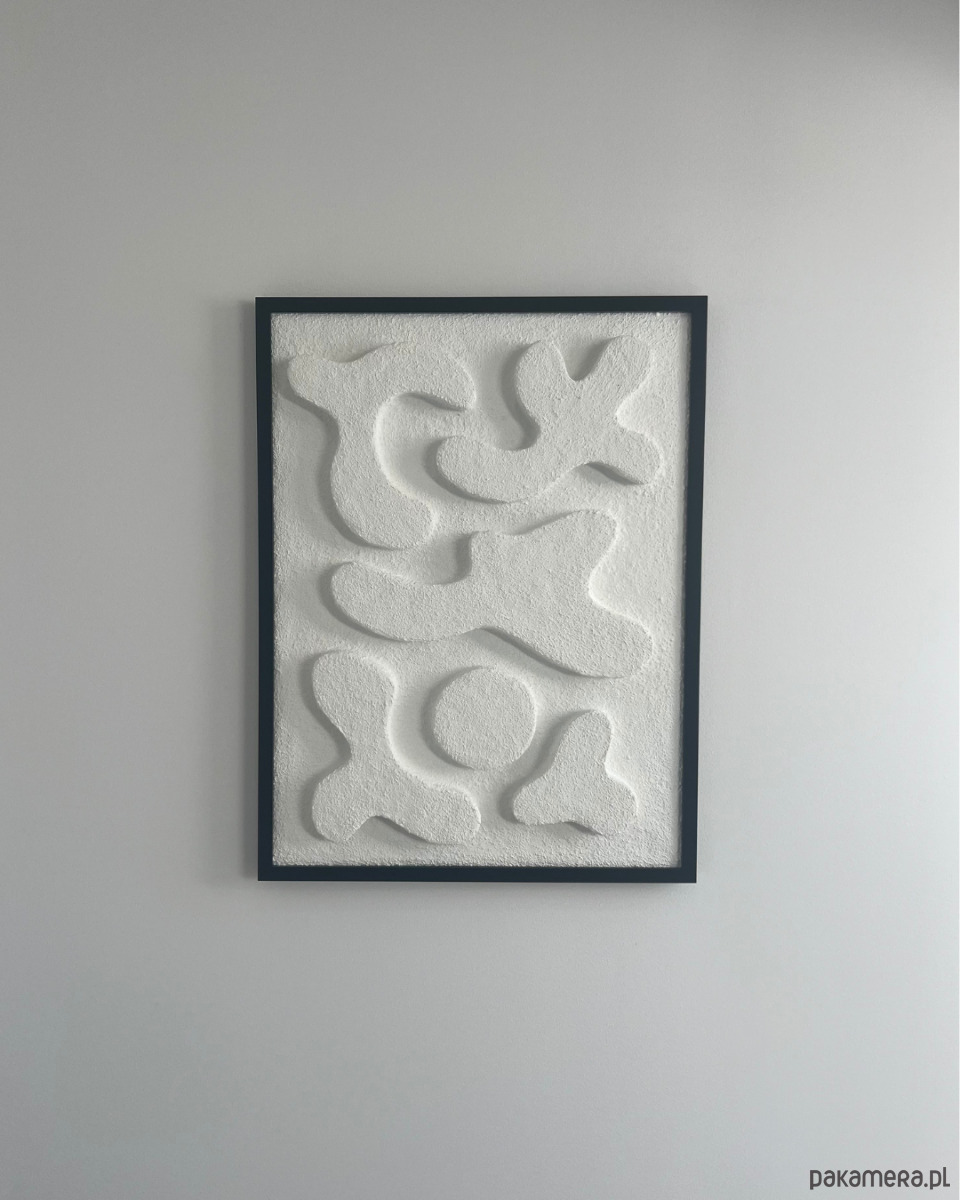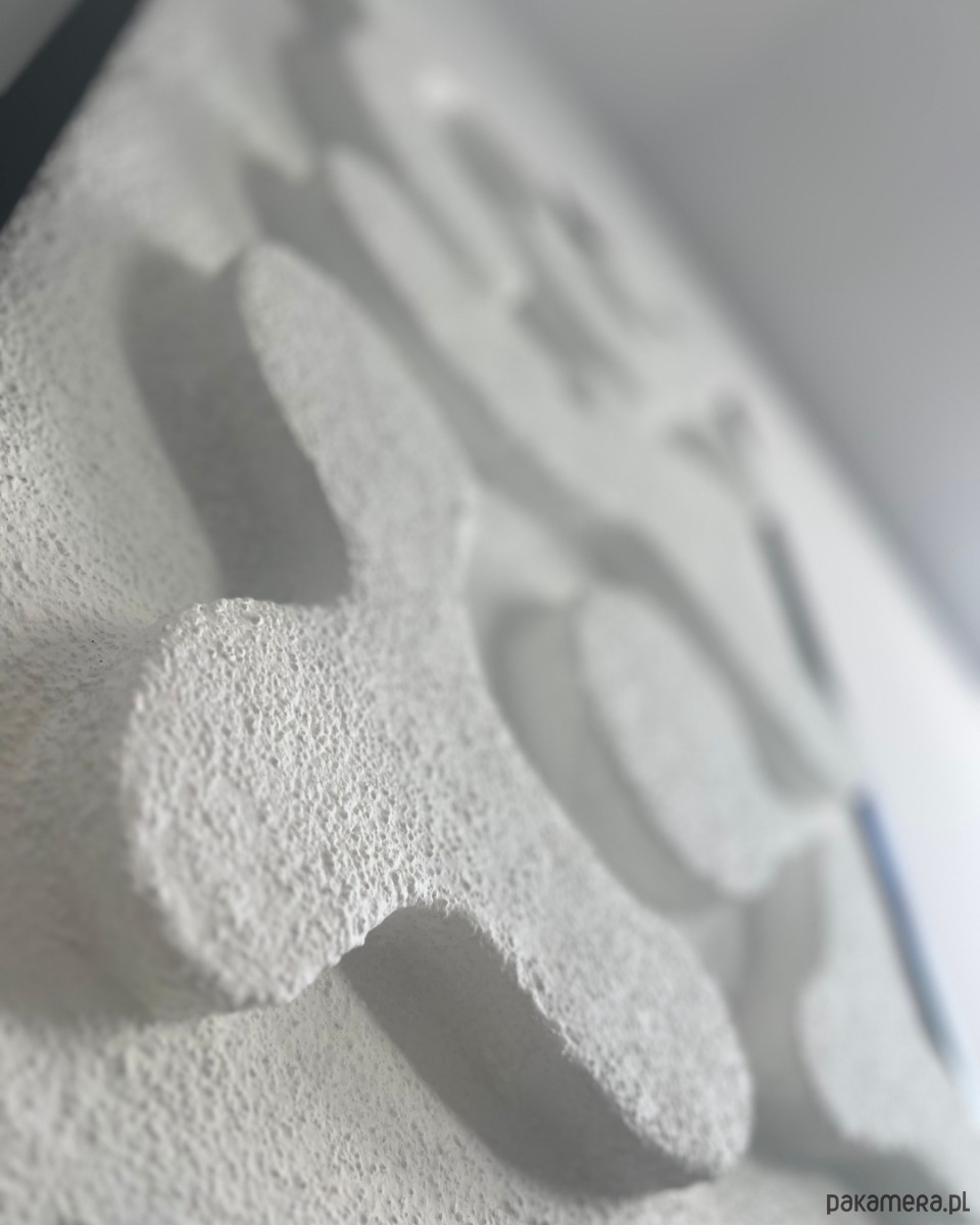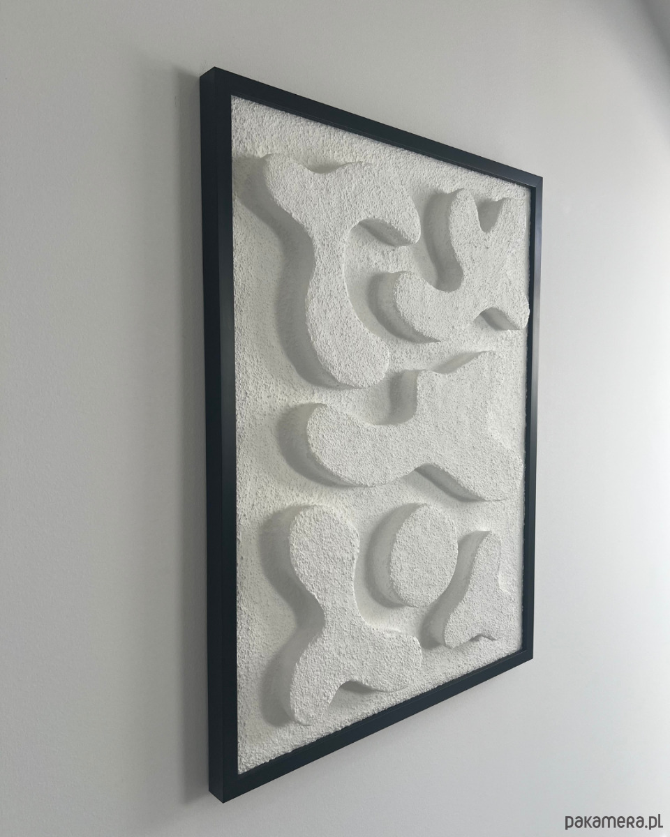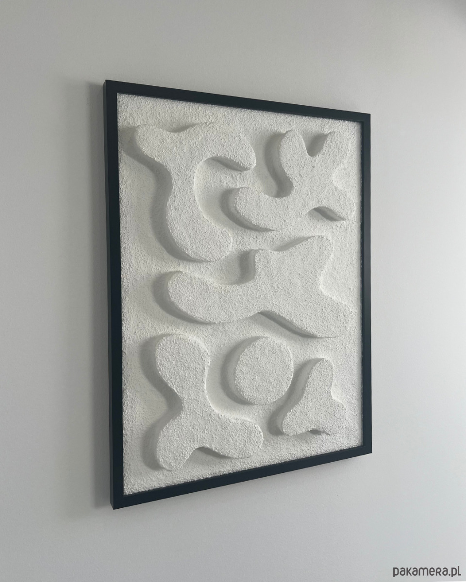 Statyczna eksplozja form, tekstur i głębi. Nasze unikatowe, ręcznie wykonane rzeźby ścienne zmieniają się w zależności od punktu widzenia obserwatora. Niektóre detale wydają się być ukryte, a po chwili stają się wyraźne i dominujące. Autorska mieszanka gipsu została wykorzystana w sposób, który doskonale imituje charakterystyczną strukturę tkaniny boucle. Delikatne “pętelki” i nierówności sprawiają, że rzeźba nabiera życia, tworząc efekt głębi i trójwymiarowości, jest pełna dynamizmu, choć w rzeczywistości pozostaje nieruchoma. Kolorystyka jest stonowana i naturalna, pasująca idealnie do estetyki wabi-sabi. Subtelne odcienie bieli podkreślają spokojny charakter rzeźby, wprowadzając do przestrzeni nutę elegancji i harmonii.