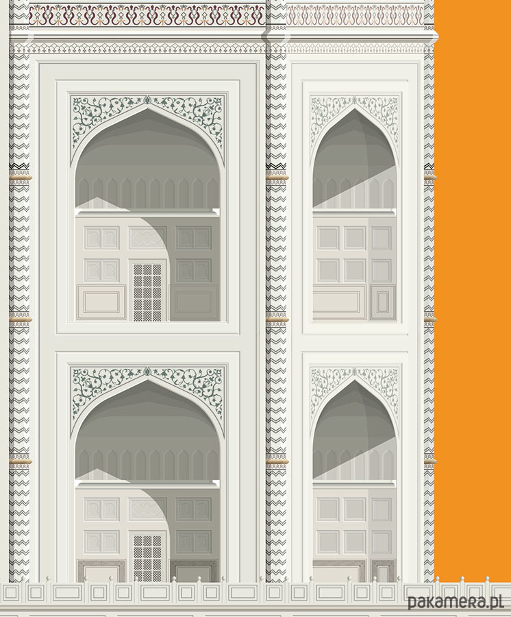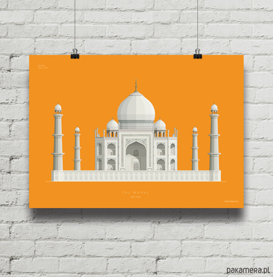 Plakat z autorską grafiką inspirowany mauzoleum Taj Mahal w Agrze w Indiach. Pochodzi z serii "Dookoła Świata" i przedstawia kompleks wzniesiony przez władcę Szahdżahana na pamiątkę przedwcześnie zmarłej żony Mumatz Mahal. Wedle odnalezionych dokumentów właściwym architektem mauzoleum był Ustad Ahmad Lahori.