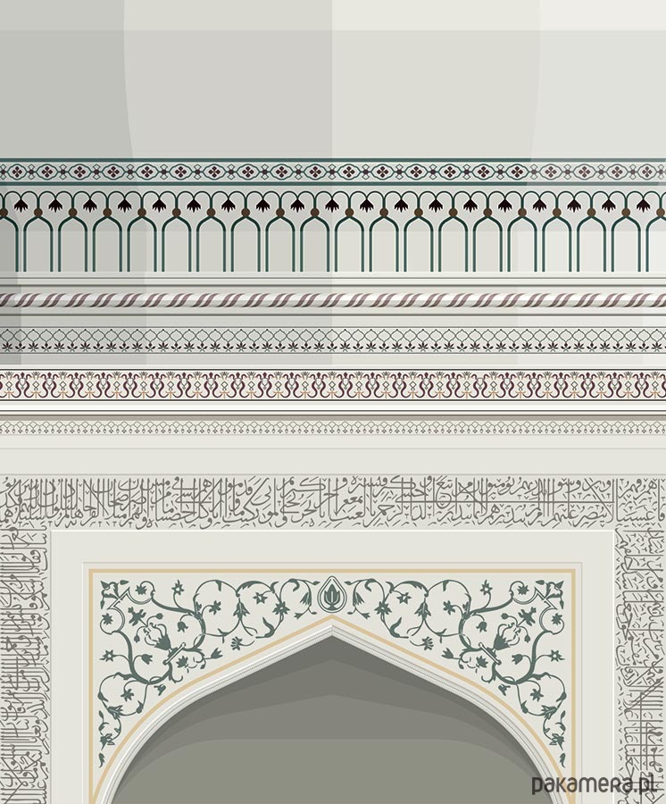 Plakat z autorską grafiką inspirowany mauzoleum Taj Mahal w Agrze w Indiach. Pochodzi z serii "Dookoła Świata" i przedstawia kompleks wzniesiony przez władcę Szahdżahana na pamiątkę przedwcześnie zmarłej żony Mumatz Mahal. Wedle odnalezionych dokumentów właściwym architektem mauzoleum był Ustad Ahmad Lahori.