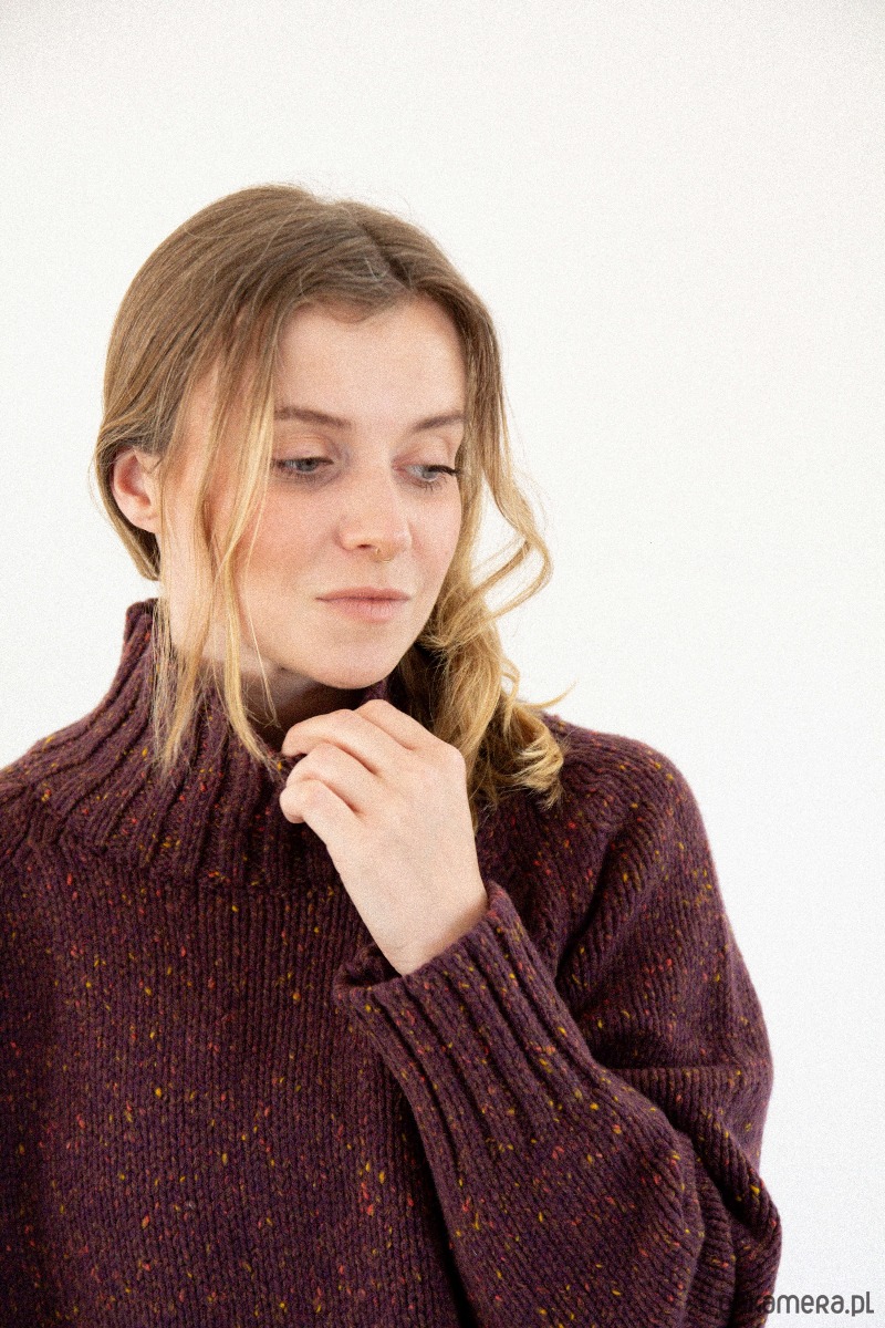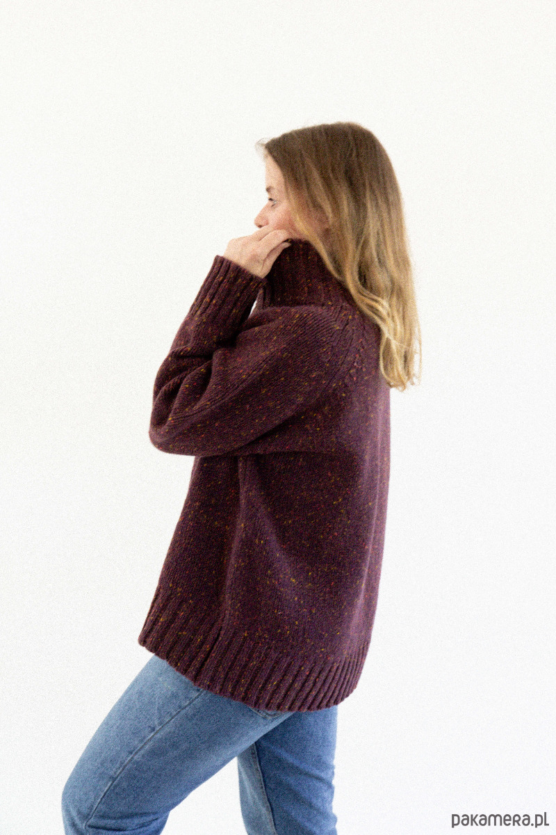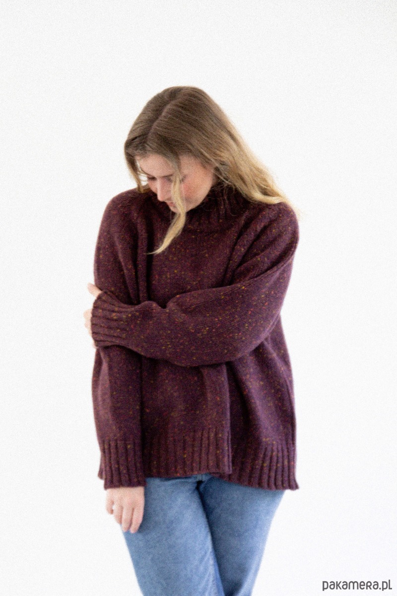 TAJRA - Oversizowy Sweter z Golfem Bordowy Melanżowy 100% Wełny Merino