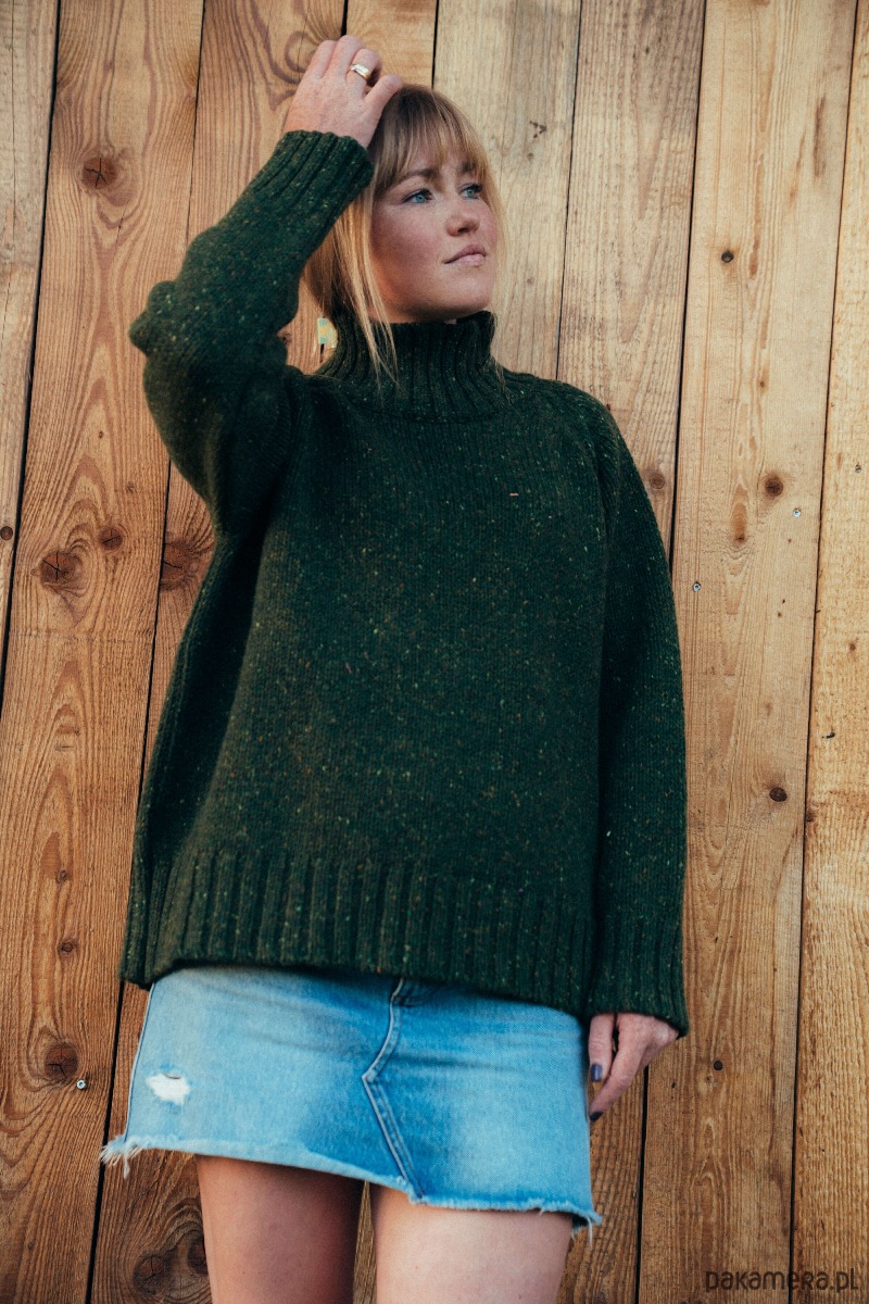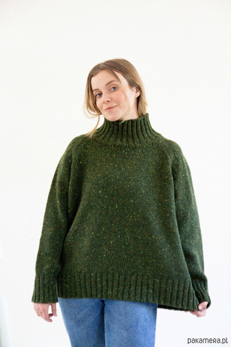 TAJRA - Oversizowy Sweter z Golfem Zielony Melanżowy 100% Wełny Merino
