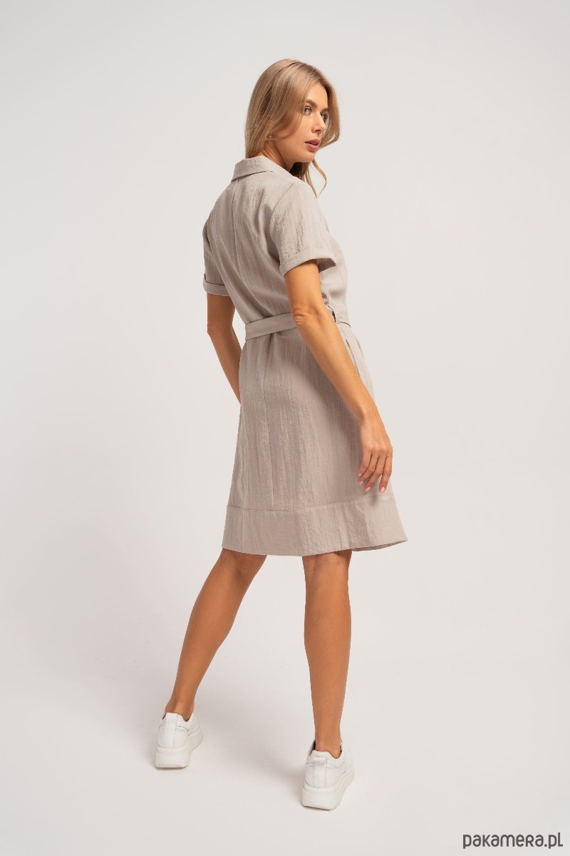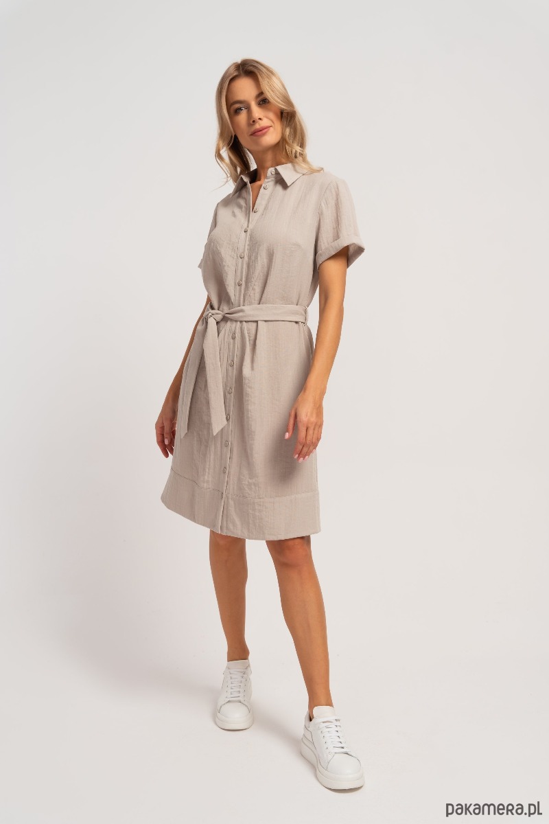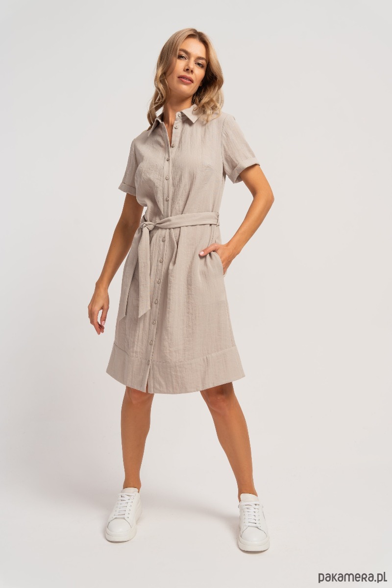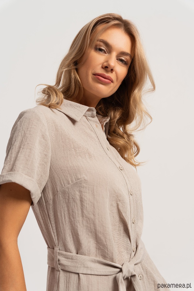 Koszulowa sukienka mini w kolorze beżowym. Uszyta z przyjaznej dla skóry wiskozy. Luźne i krótkie rękawy, ozdobione podwiniętym mankietem. W talii szarfa na szlufkach - zawiązana z przodu podkreśli kobiecą figurę, zawinięta do tyły nada sukience formy oversize. Swobodny krój o delikatnie taliowanej formie, pozwala nosić sukienkę na różne sposoby. Na wysokości bioder dwie niewidoczne kieszenie, wpuszczone we szwie. Dół o nieregularnej linii z ozdobnym przeszyciem i rozcięciem po bokach. Szmizjerka od kołnierzyka w dół, zapinana jest na guziki.