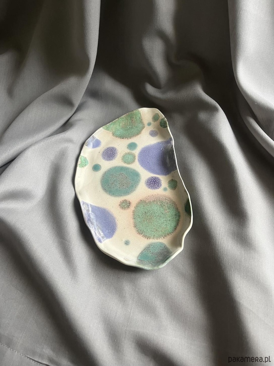 Unikatowy ceramiczny talerz półmisek w odcieniach beżu zdobionego plamami zieleni, granatu i lila, tworzących niepowtarzalne kompozycje barwne.