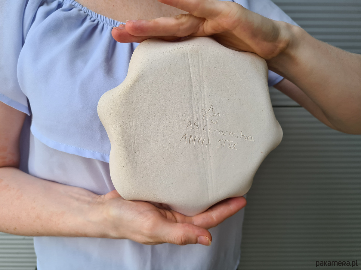 Polecam talerzyk z mandalą w kolorze turkusowym na żółtym tle. Talerz wykonany z jasnej gliny, zdobiony angobą i szkliwem transparentnym do kontaktu z żywnością.