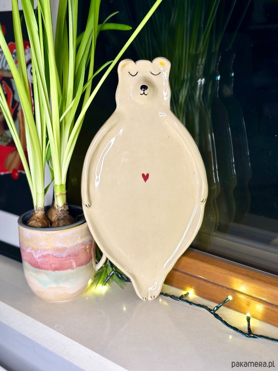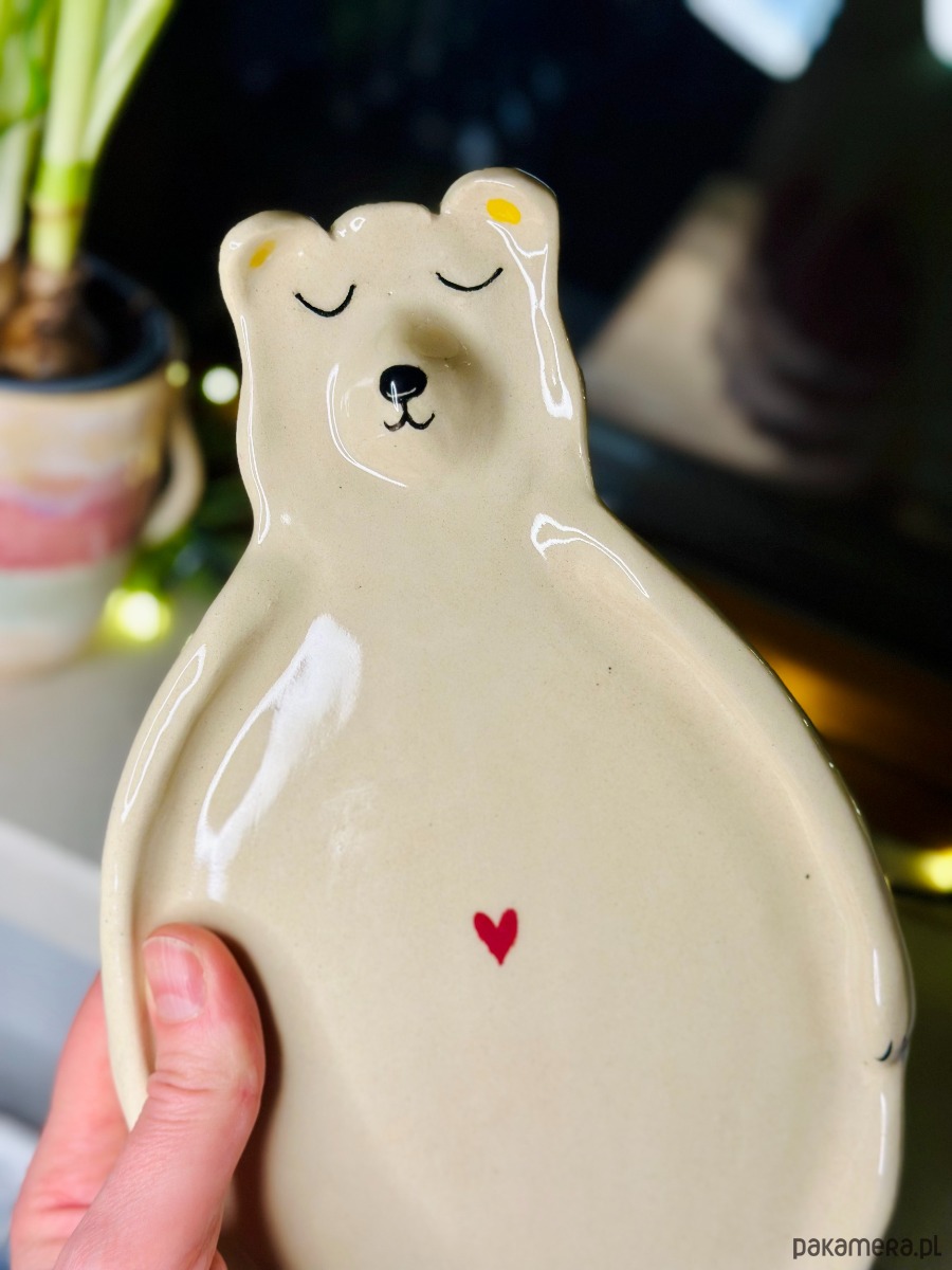 Ręcznie wykonany talerzyk ceramiczny w kształcie uroczego misia. Utrzymany w ciepłym, kremowym odcieniu, z delikatnie malowanymi detalami twarzy i subtelnym czerwonym serduszkiem na brzuszku. Prosta forma i spokojny wyraz misia nadają mu wyjątkowo przytulny, kojący charakter.