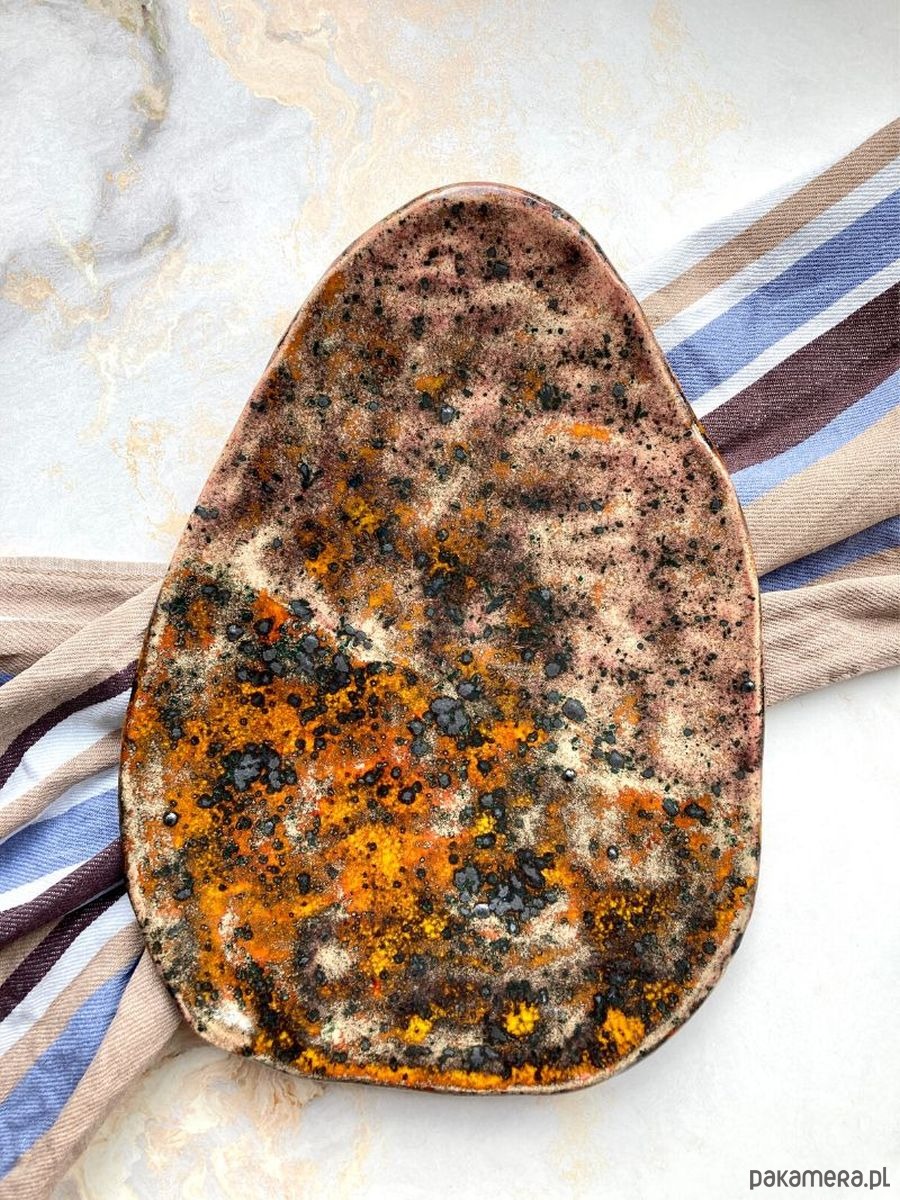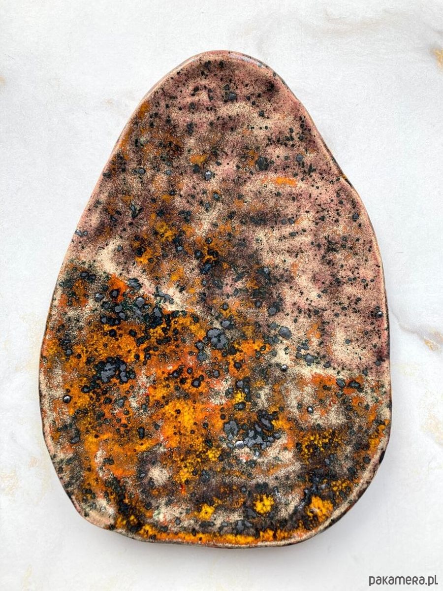 Bardzo oryginalny talerz w postaci jajka. Jajko jest nieregularne i ciekawie poszkliwione. Przenikają się w nim kolory od fioletowo-kremowego do pomarańczowego ze stalowymi plamami, które czasem wystają. Kto z nas nie lubi kolorowych dodatków na stole, jak już trochę jedzenia z niego zniknie? A tutaj mamy cała gamę barw. Sprawdzi się w każdym wydaniu na wielkanocnym stole. Nietuzinkowy w każdym calu wpadnie w oko nie tylko dzieciom, ale także dorosłym. Osobiście bardzo lubię otaczać się przedmiotami robionymi z serca, które są wyjątkowe ze względu na swoją formę i wykonanie.