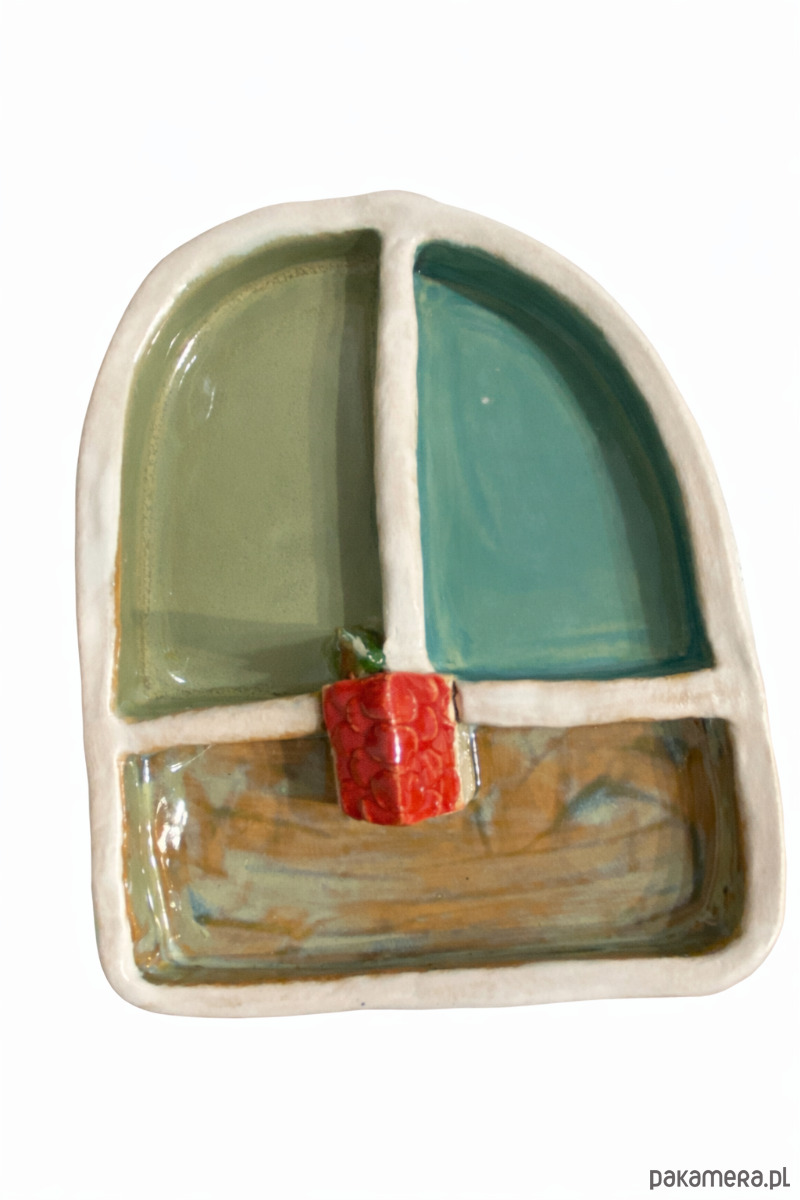 Ręcznie wykonany ceramiczny półmisek o dekoracyjnej formie z subtelnym motywem małego domku. Idealny do serwowania przekąsek, przystawek lub słodkości. Dzięki oryginalnemu wzornictwu może również pełnić funkcję dekoracyjnego elementu na stole lub w kuchni.