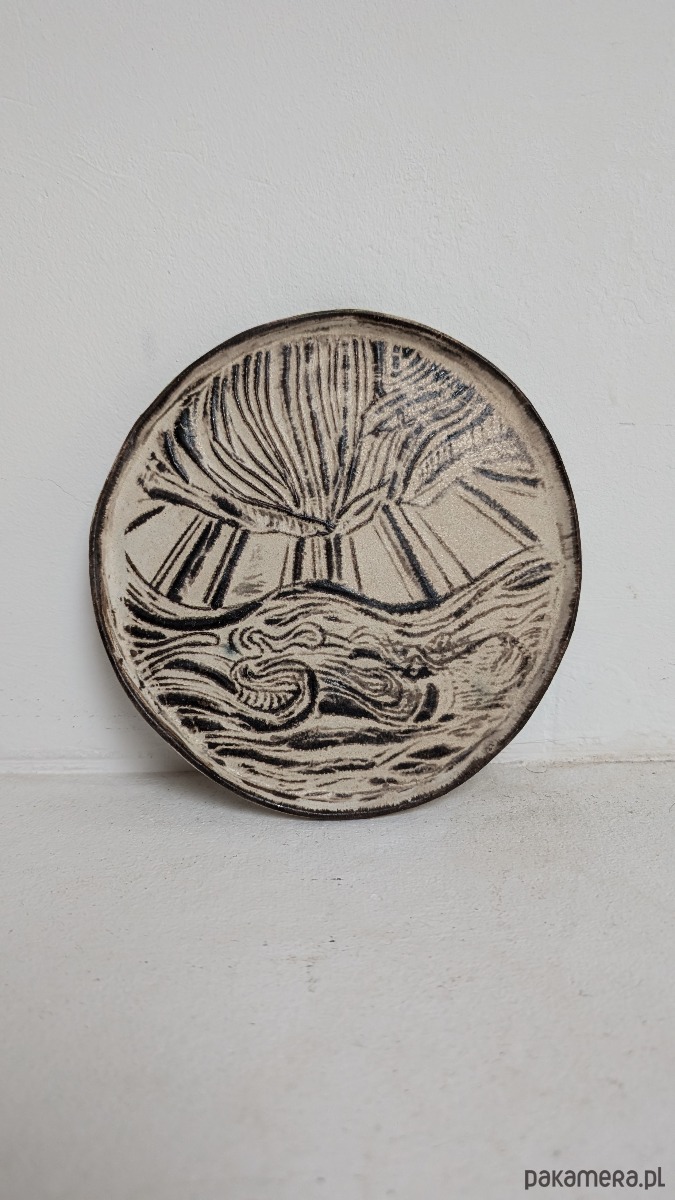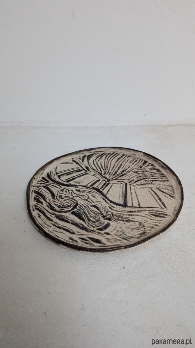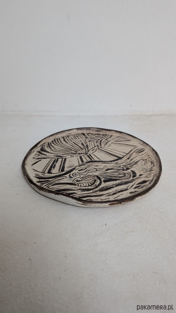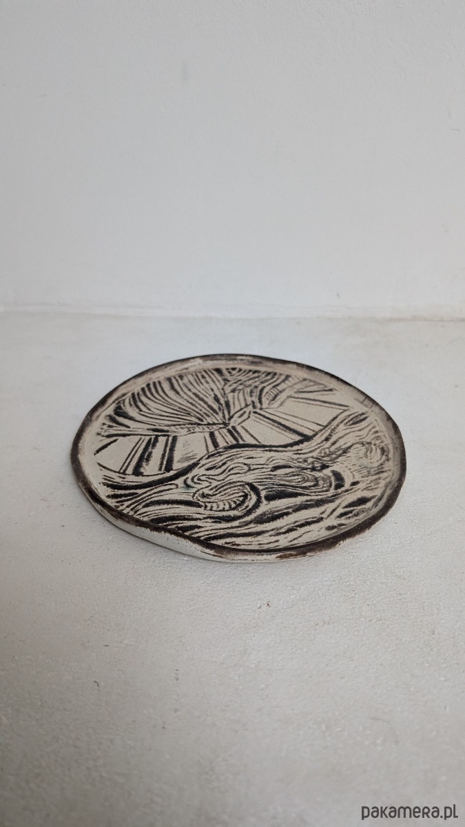 Ręcznie zdobiony mały talerzyk, który stanie się wyjątkowym dodatkiem do Twojego wnętrza! Odbita na nim grafika powstała techniką linorytu. Wykonany z gliny wypalonej na 1210 stopni, doskonale sprawdzi się jako podstawka na biżuterię, świeczki, drobne przekąski lub dekoracyjny akcent na stole. Wykorzystane szkliwa są bezpieczne w kontakcie z żywnością.