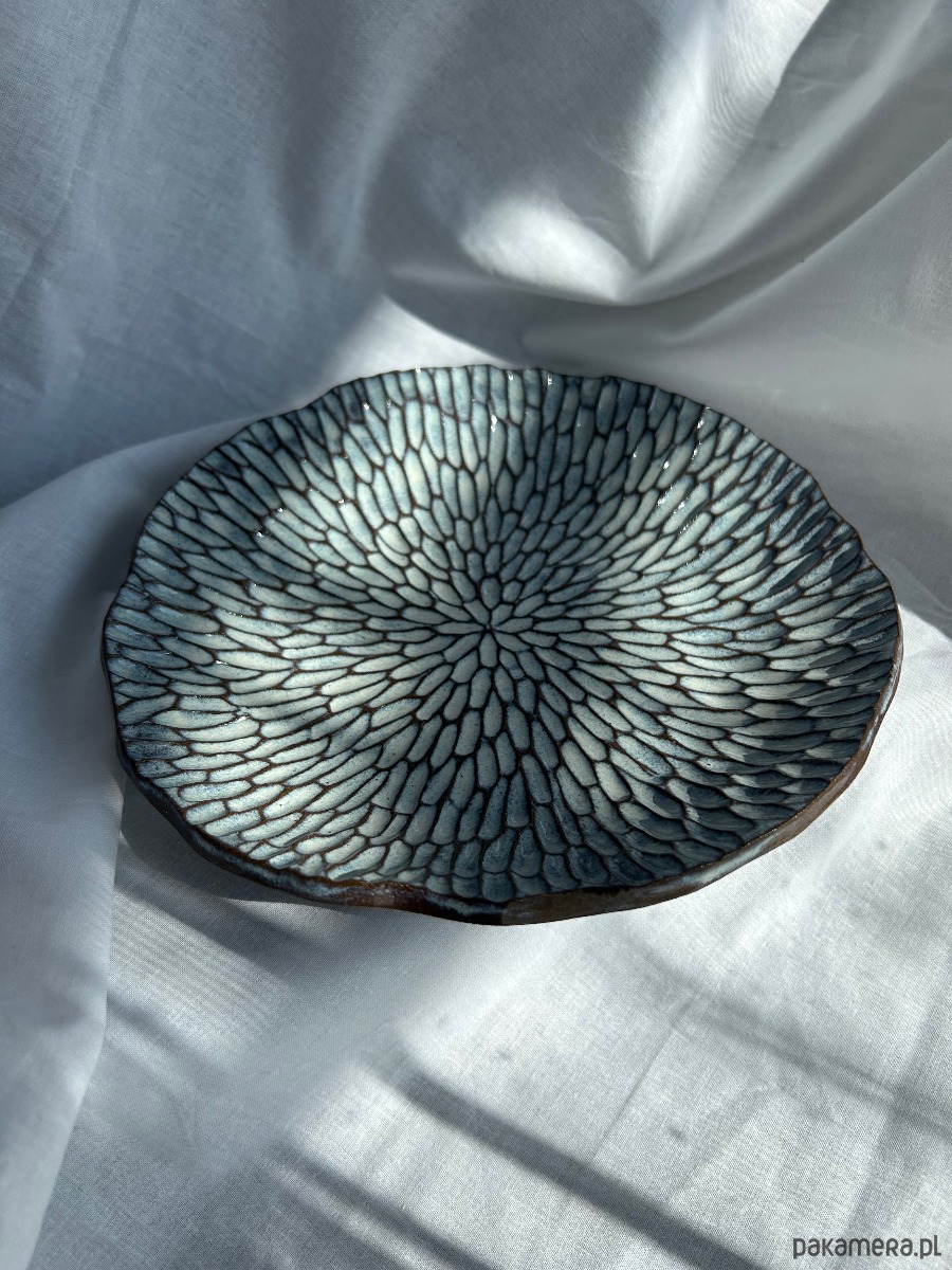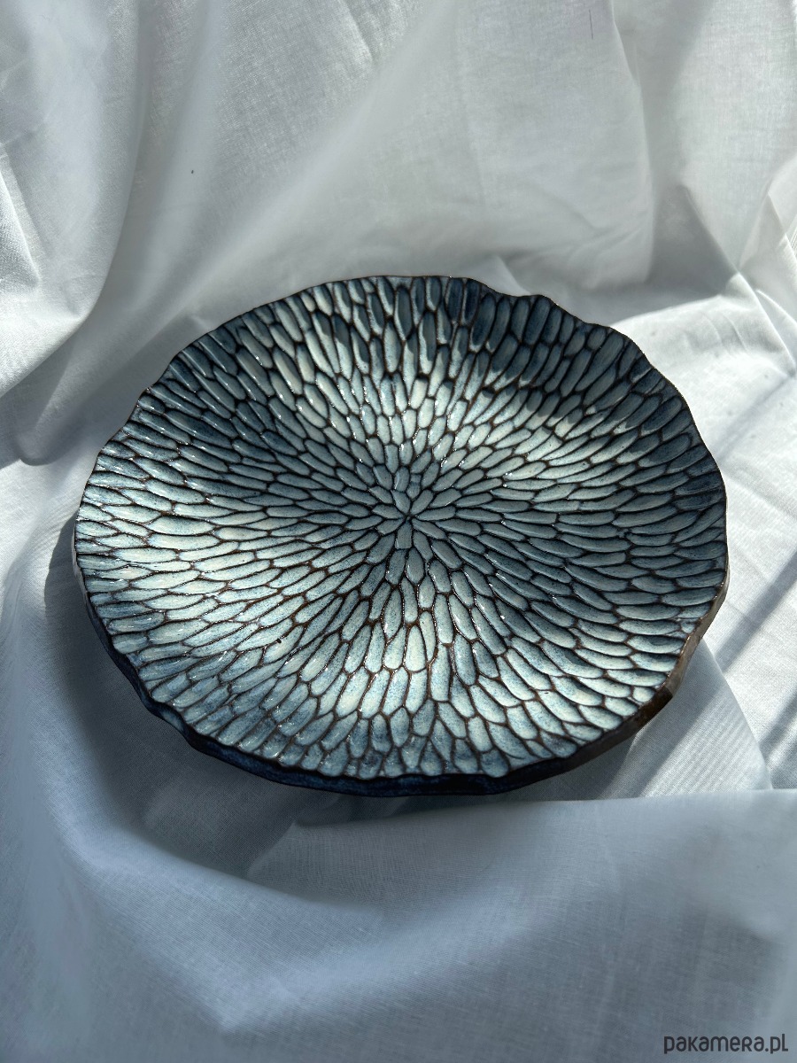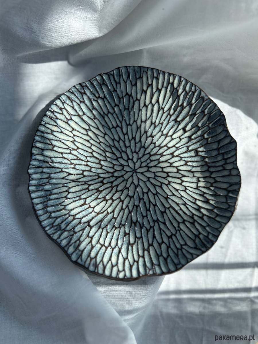 Talerz do serwowania, ręcznie wykonany z użyciem ciemnej gliny. Wzory ręcznie wykrajane specjalnym narzędziem. Szkliwo którego użyłam nadaje się do kontaktu z żywnością. Każdy talerz jest unikatowy i niepowtarzalny.