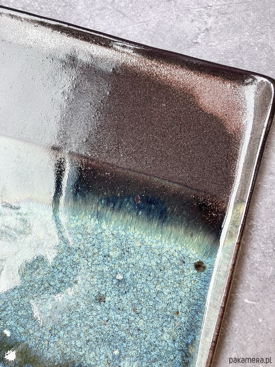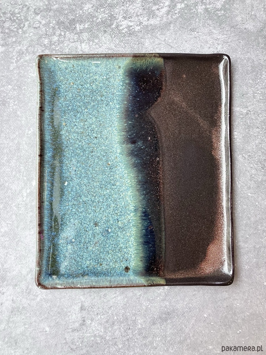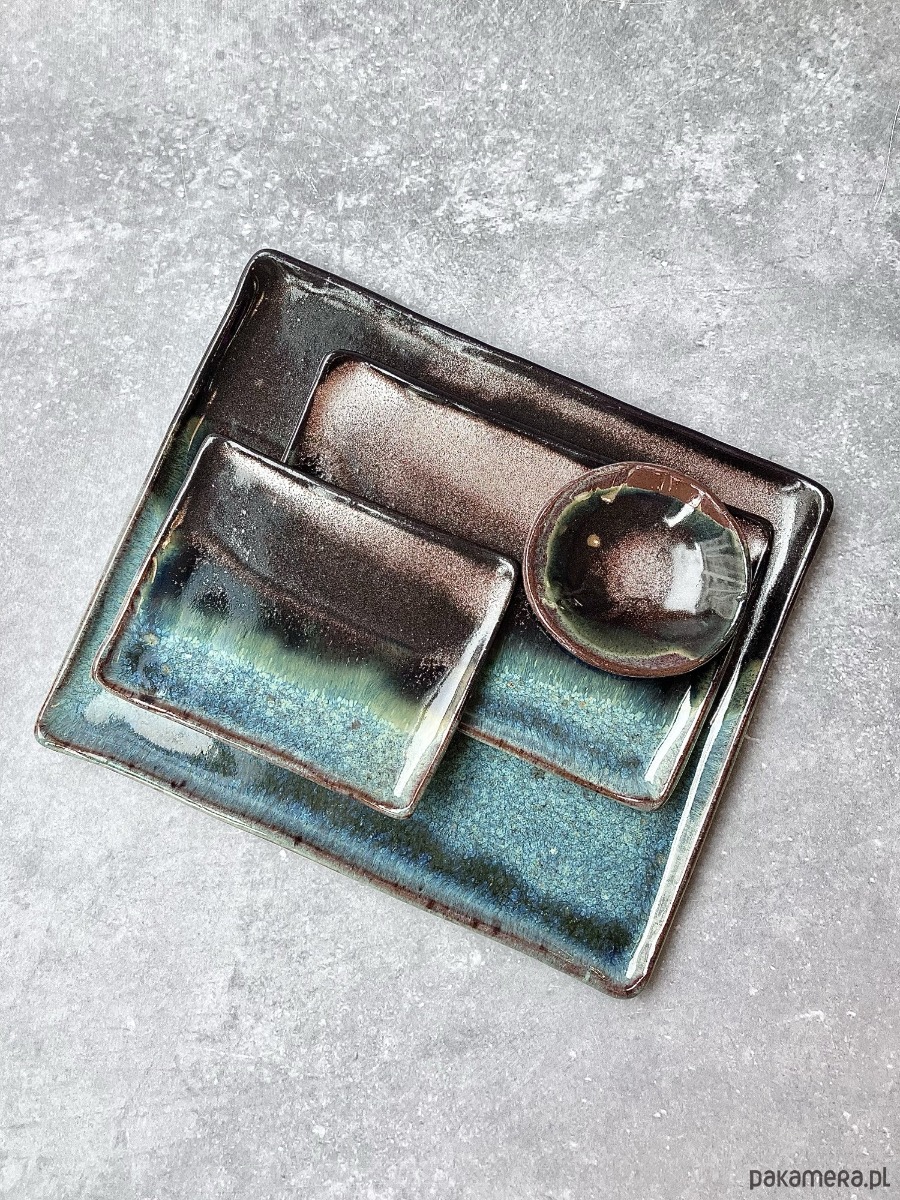 Talerze do sushi GLOW to wyjątkowe, ręcznie wykonane naczynia stworzone z myślą o eleganckim podawaniu sushi, przystawek oraz drobnych dań. Ich powierzchnię zdobi efektowne, wielowarstwowe szkliwo w odcieniach głębokiego brązu, turkusu, zieleni i granatu, które przenikają się niczym świetliste refleksy na wodzie. Każdy talerz jest niepowtarzalny- układ kolorów i efekty krystalizacji szkliwa za każdym razem tworzą unikatowy obraz.